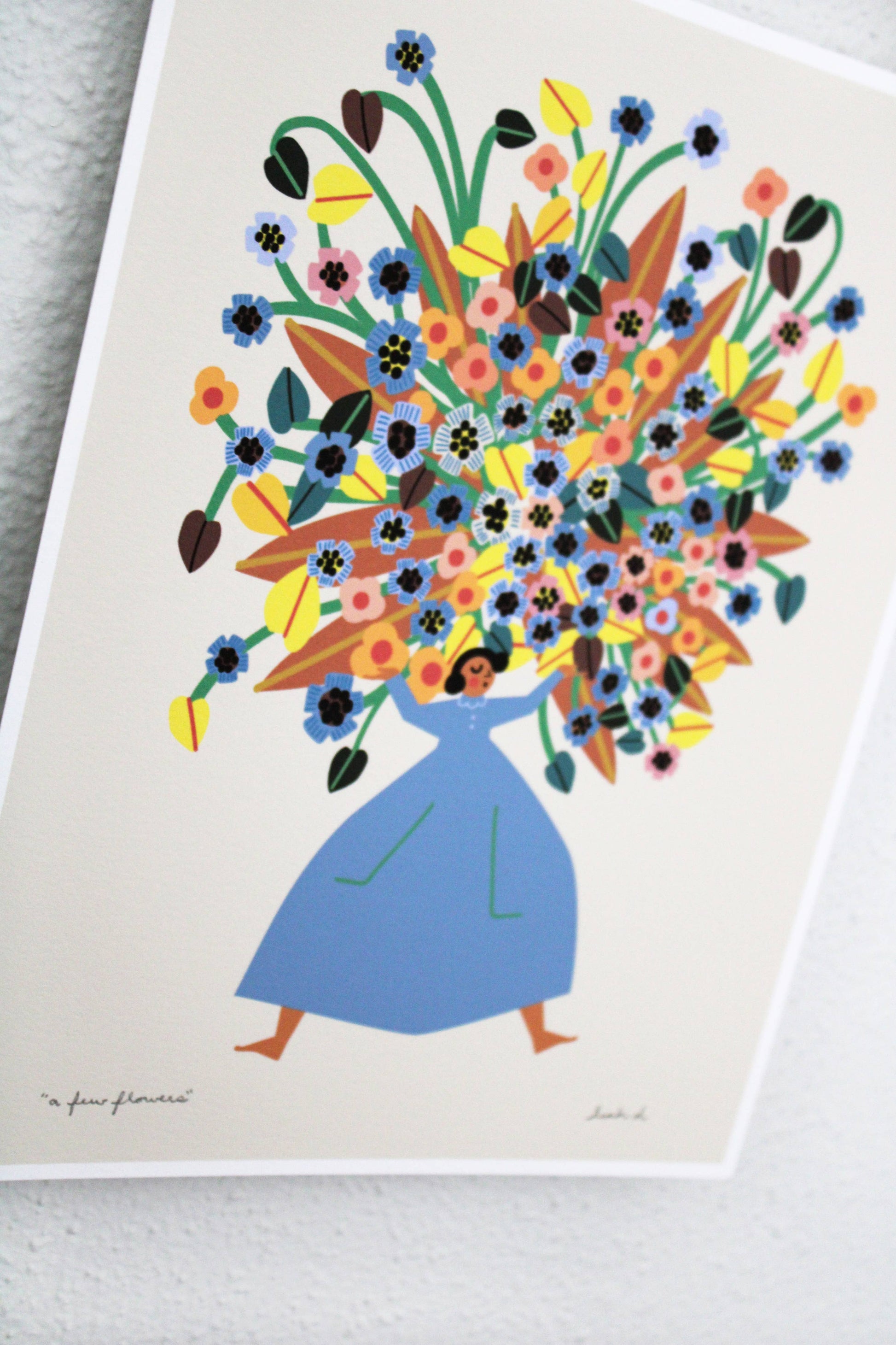 This is an archival print of Leah's "A Few Flowers" illustration in tones of peach, black, coral, orange, yellow, white, green, brown, and light blue on a light beige background.