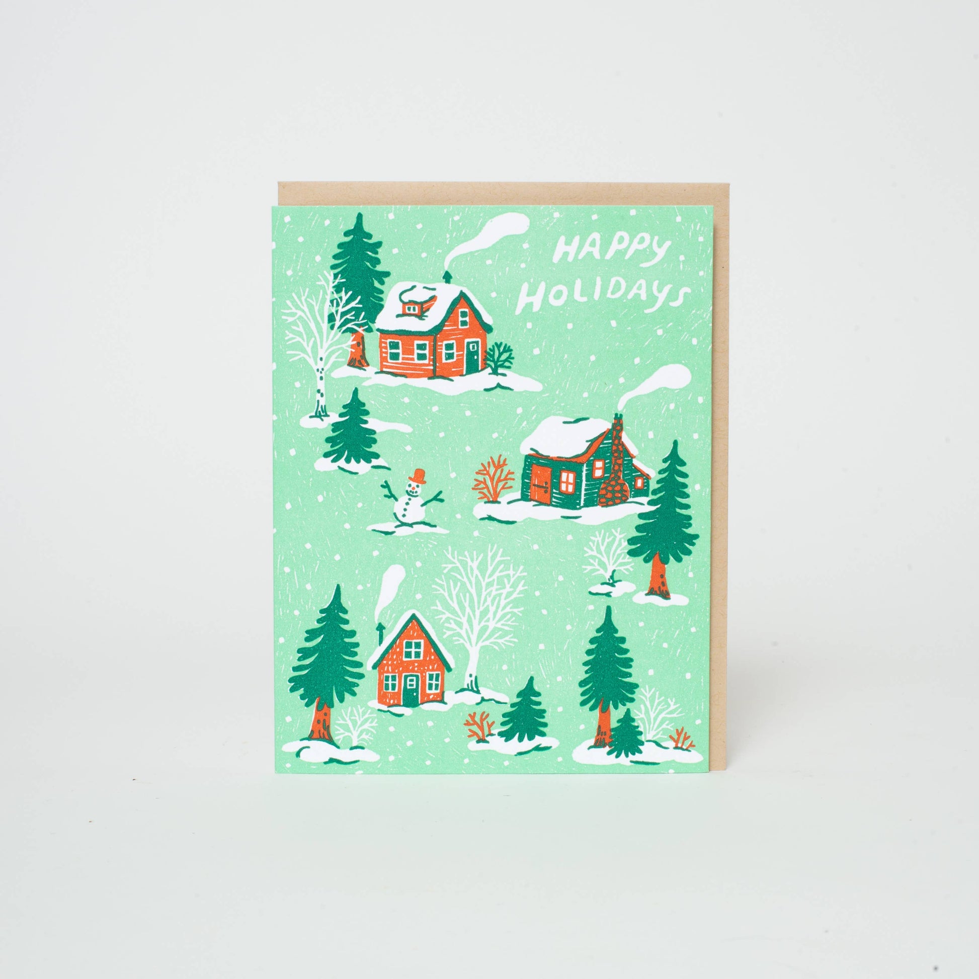 Christmas Cottages Letterpress Greeting Card by Phoebe Wahl