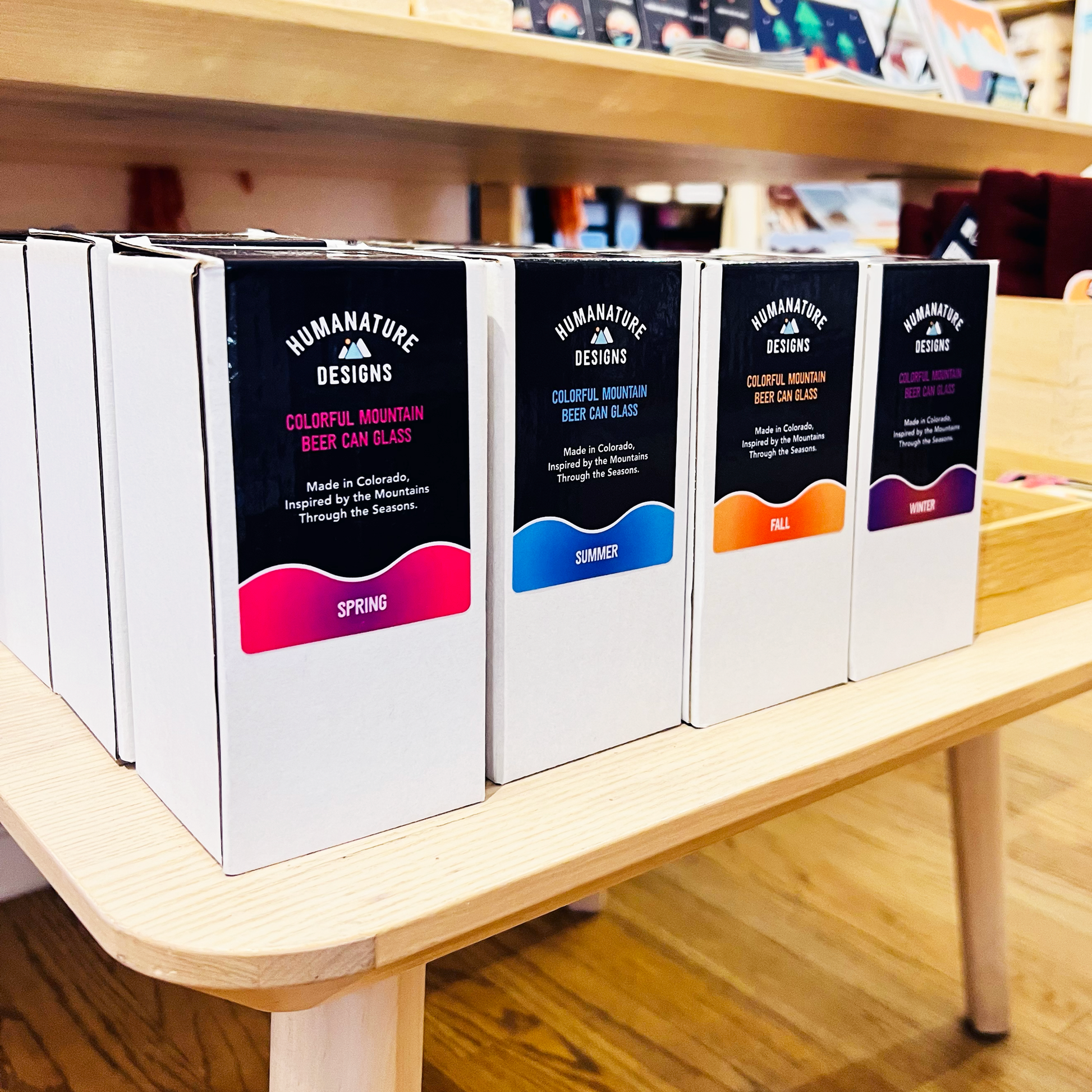 Our newest creation, these colorful glasses feature mountain landscape designs that wrap around the entire glass. The four colors are meant to represent the four seasons: Maroon (Spring), Blue (Summer), Fall (Orange), and Purple (Winter). These unique beer glasses will keep your customers sippin' all year 'round. They're the perfect holiday gift for nature lovers, campers, beer drinkers, or mountain town travelers.