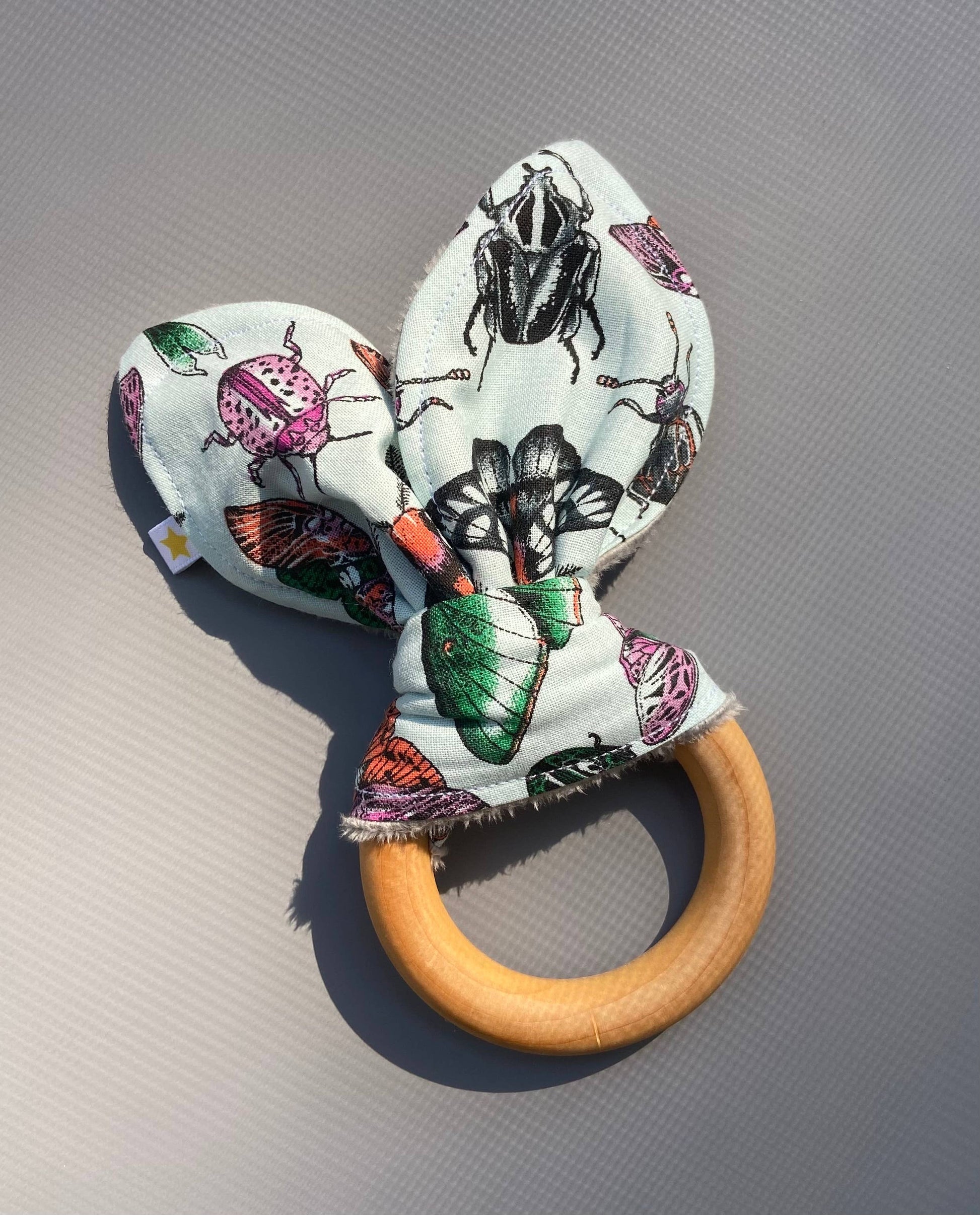 This toy does double duty! Each bunny ear looped fabric is backed with super soft snuggle fabric and has baby *crinkle paper sewn in for added sensory play.(Every wooden ring is rubbed in a small amount of organic coconut oil)