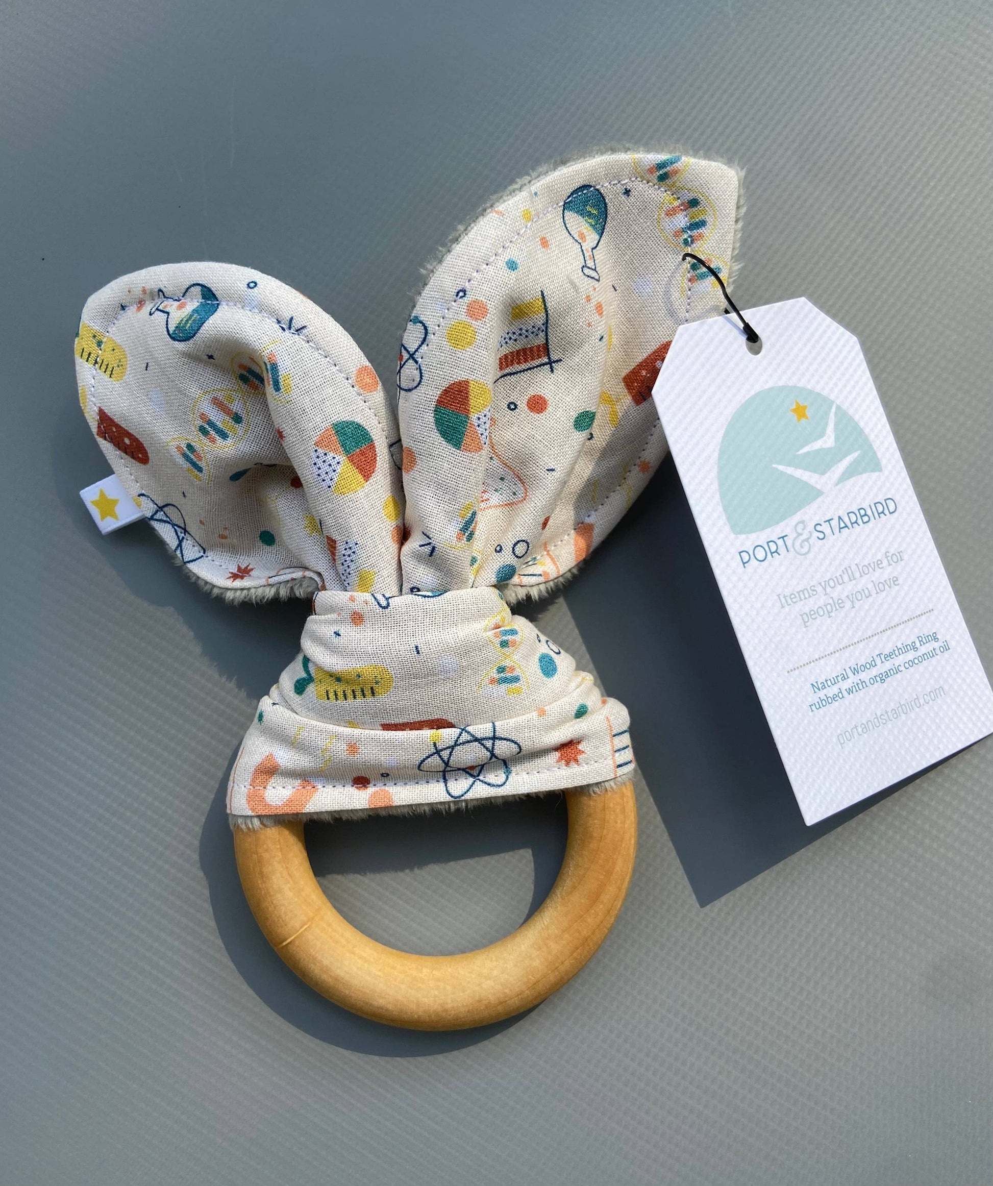 This toy does double duty! Each bunny ear looped fabric is backed with super soft snuggle fabric and has baby *crinkle paper sewn in for added sensory play.(Every wooden ring is rubbed in a small amount of organic coconut oil)