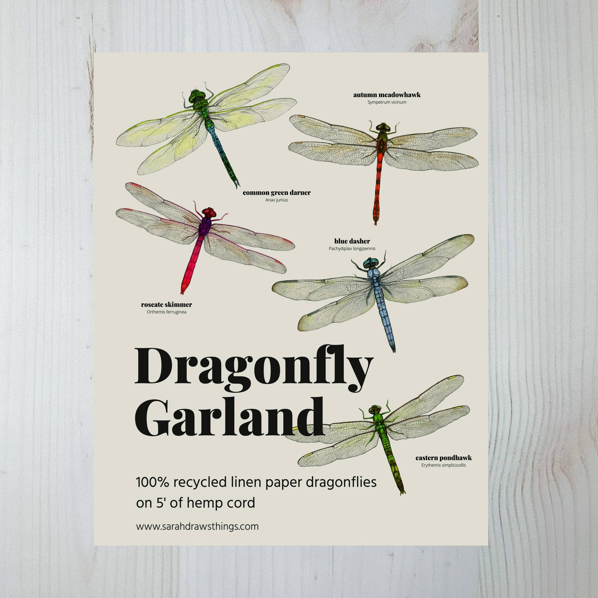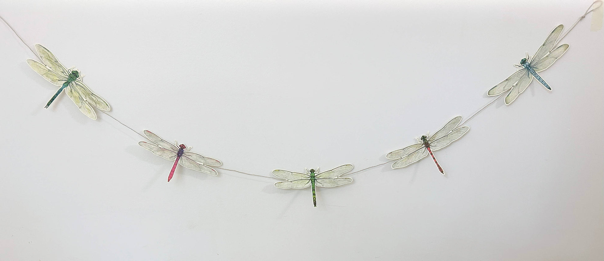 This 5' garland is made up of original watercolor, gouache and pencil illustrations. It features five colorful dragonfly drawings. Each colorful dragonfly measures about 7.5" wide and is printed on 100% recycled linen paper, and strung on eco friendly hemp cord. It is packaged in a compostable plant-based sleeve with an 8x10" white backing board.