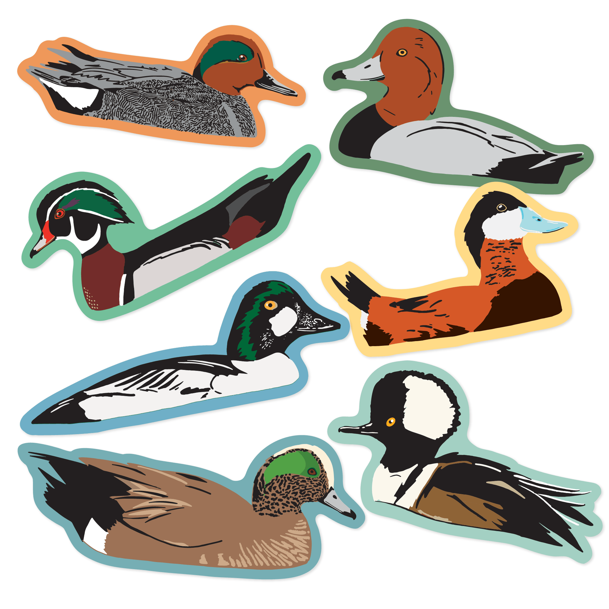 This fun sticker pack includes some of our favorite dabbling and diving duck species seen across North America. Can you find the Redhead, Common Goldeneye, Wood Duck, Ruddy Duck, Hooded Merganser, American Wigeon, and Green-winged Teal?