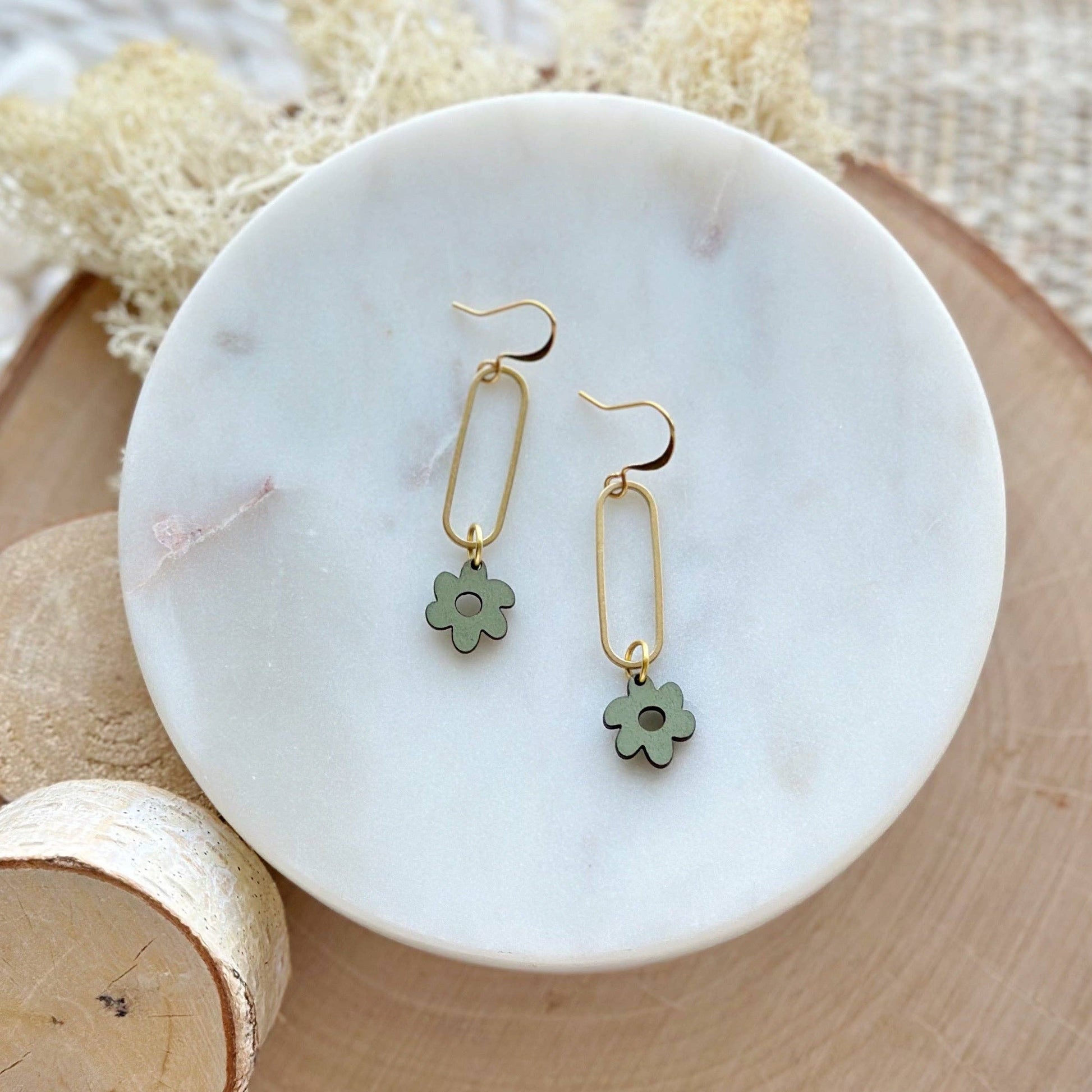 Made from hand painted basswood, raw brass, and hypoallergenic gold plated brass ear wires. Designed, engraved, and assembled in our home studio in Selah, Washington.