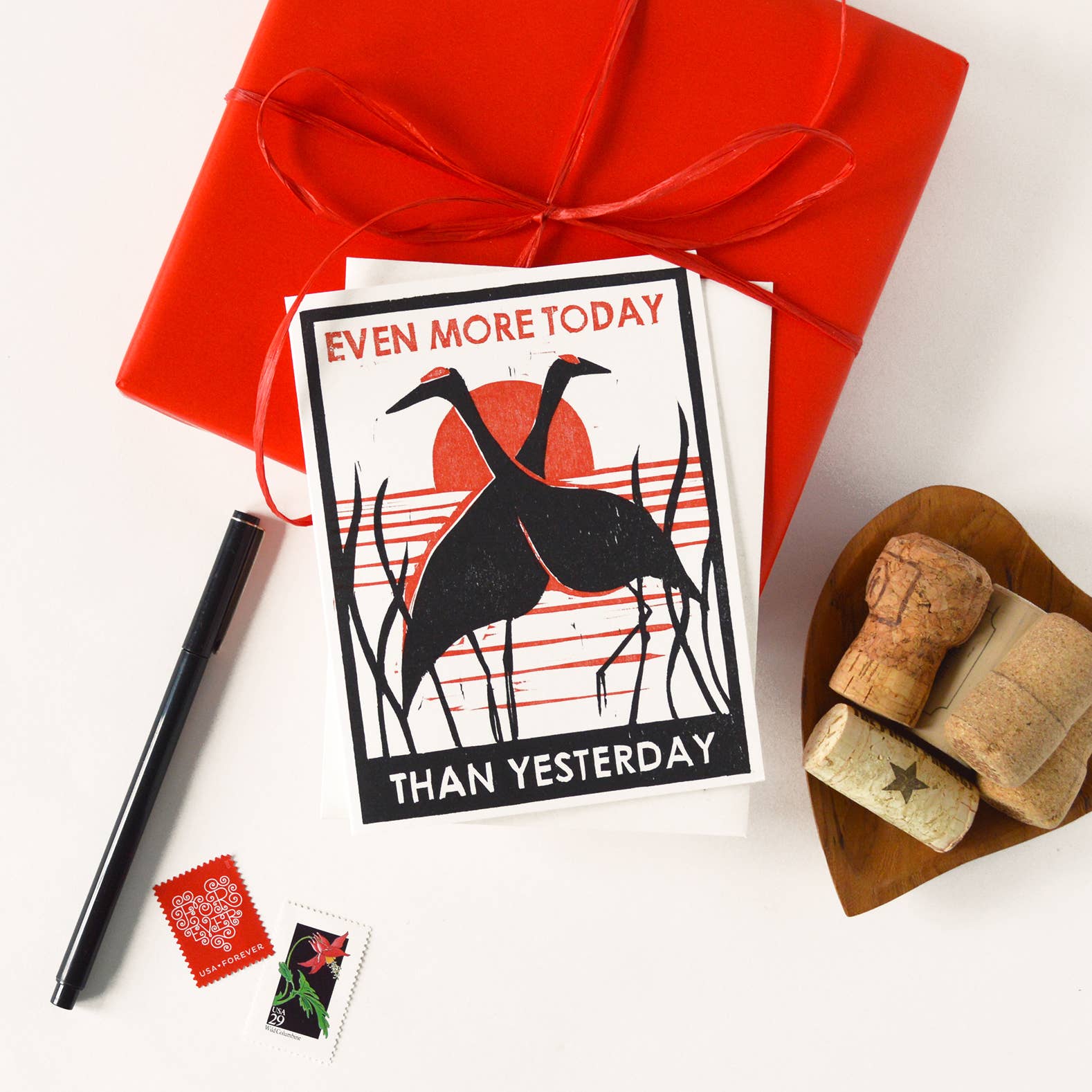 Letterpress, 100% post-consumer recycled paper, A2. Blank inside, cello sleeve with envelope.