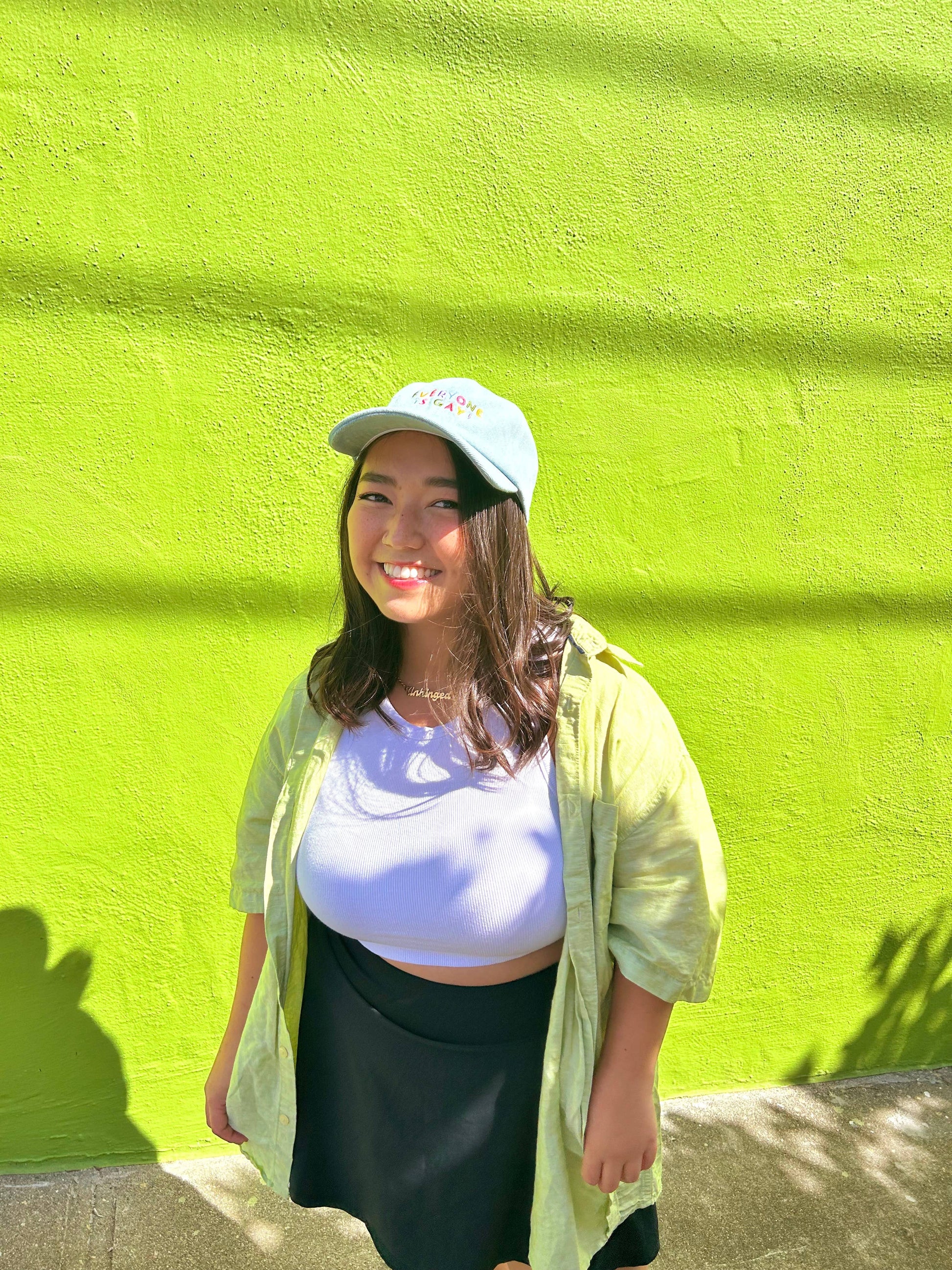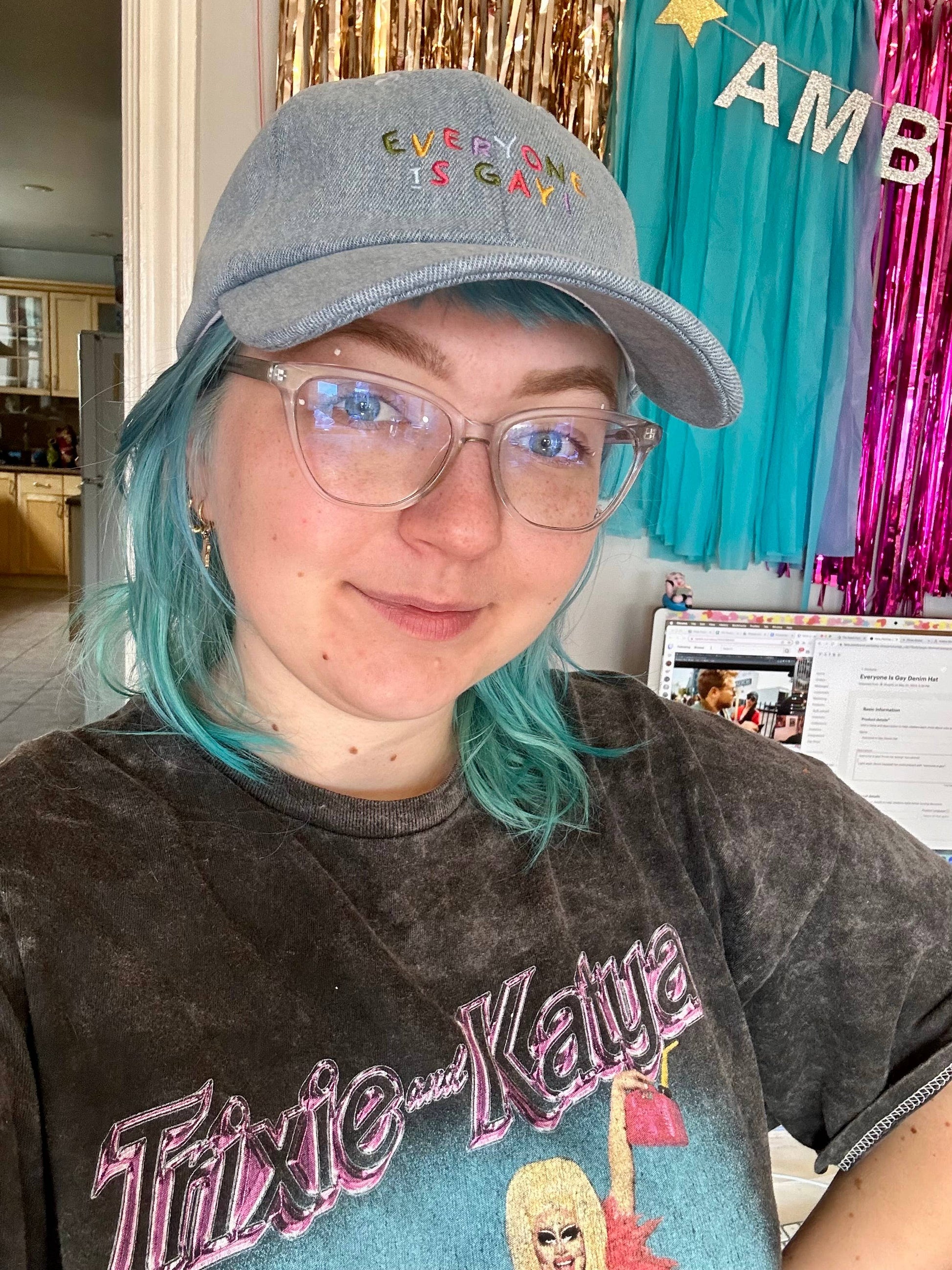 Light wash denim baseball hat embroidered with “everyone is gay!”