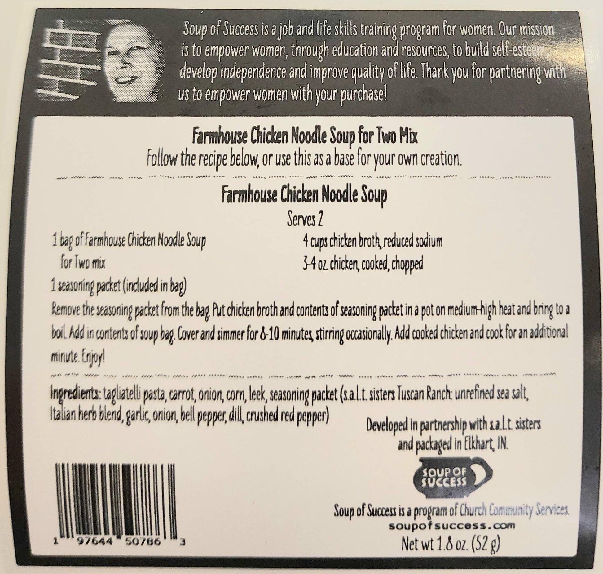 Tagliatelle pasta, carrot, onion, corn, leek, seasoning packet (s.a.l.t. sisters Tuscan Ranch: unrefined sea salt, Italian herb blend, garlic, onion, bell pepper, dill, crushed red pepper).