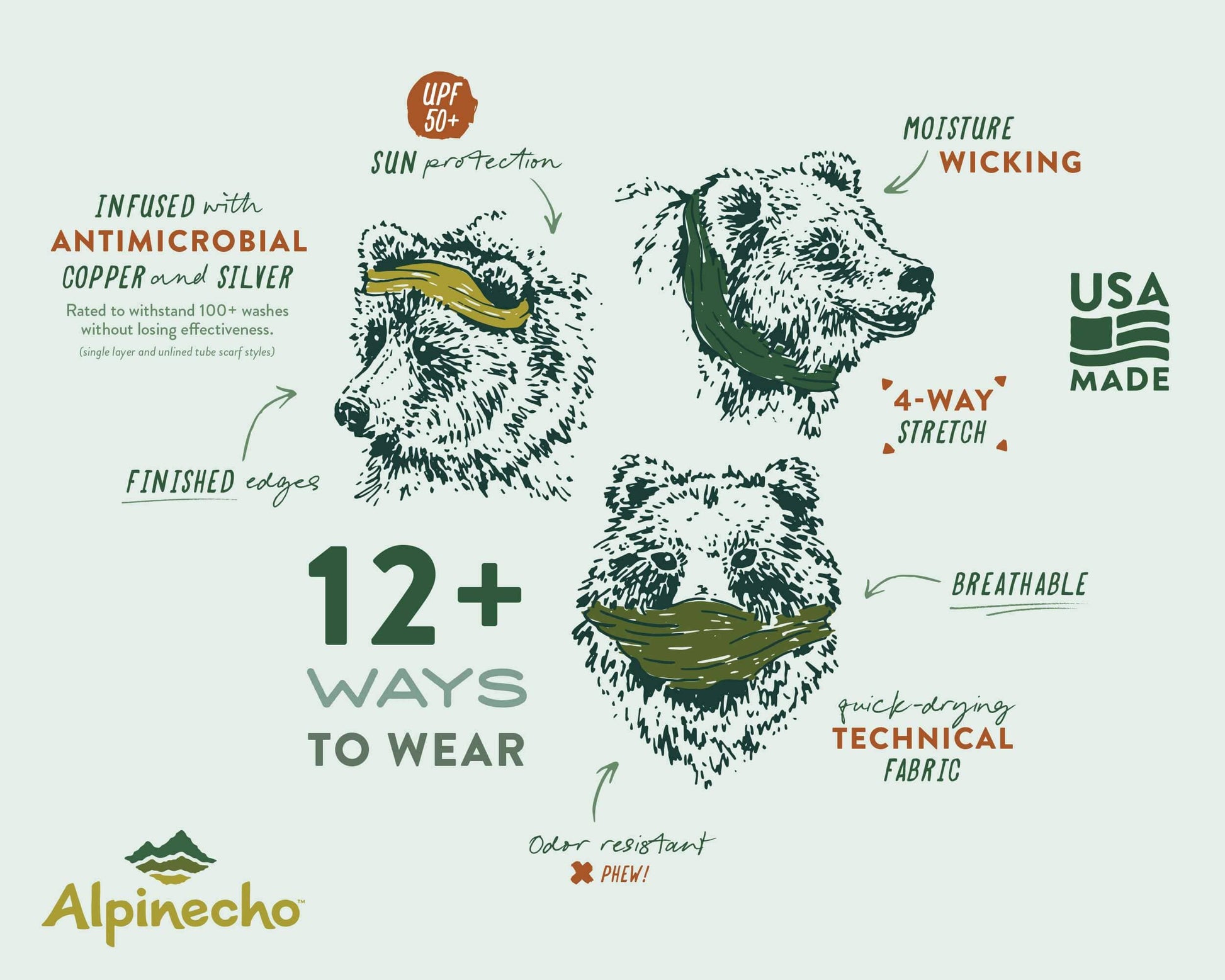 Alpinecho’s neck gaiters are milled, cut, sewn and printed in the USA with hemmed top and bottom edges. Constructed from a single piece of American-made fabric, each full-color neck gaiter is infused with antimicrobial copper and silver and is quick drying, freeze resistant, UPF 50+, odor-resistant, breathable, and moisture wicking. Can be worn 12+ ways!