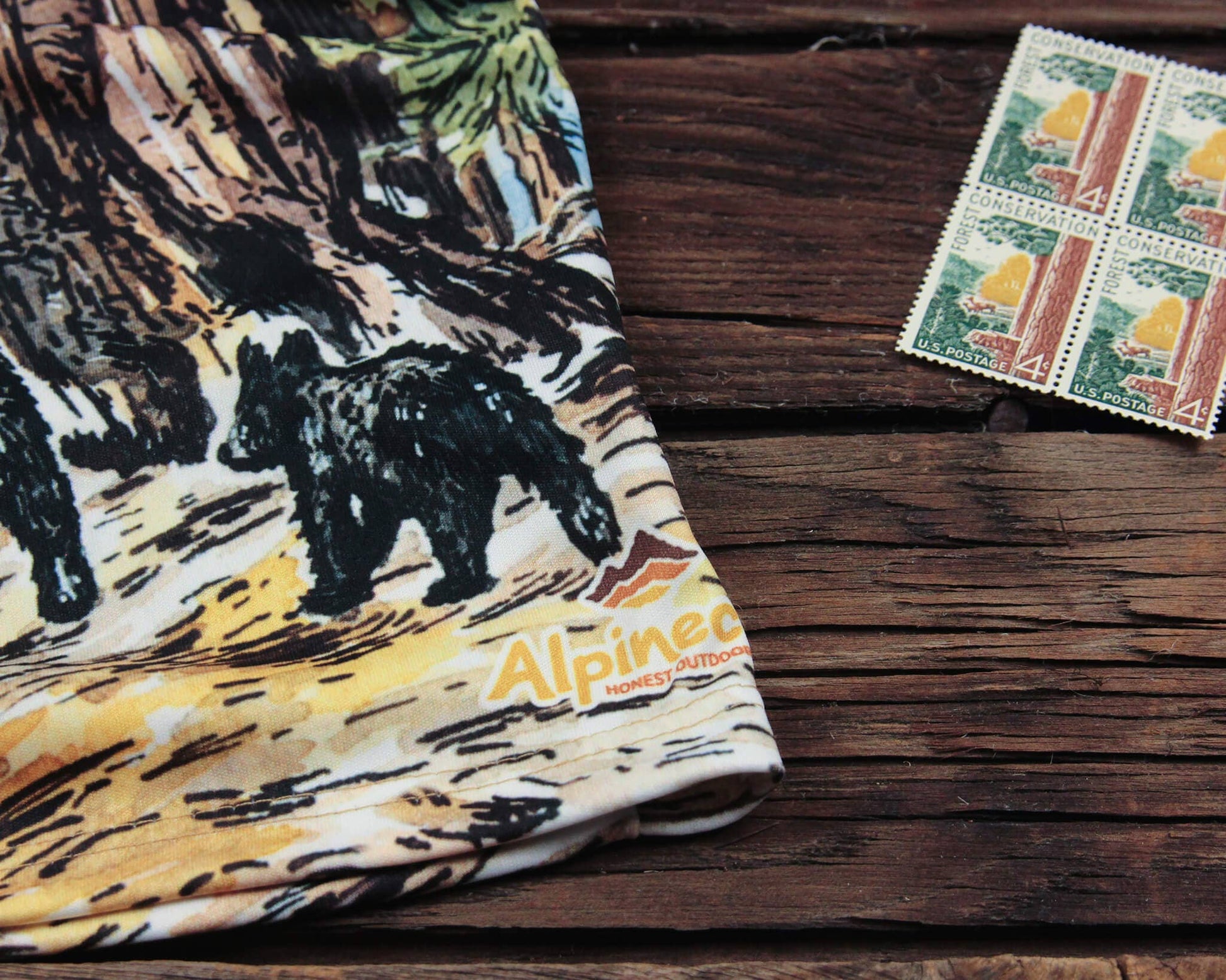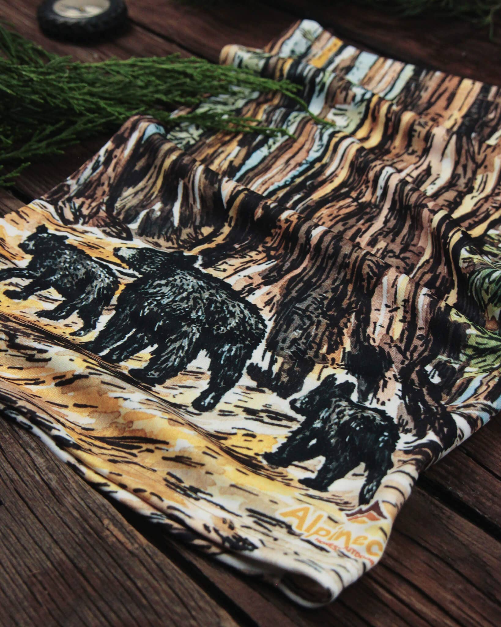 The Forest Bears neck gaiter features a custom pen, ink, and watercolor design of a mother black bear and her cub in the forest. Created for, and sold at, Sequoia and Kings Canyon National Parks, but equally at home in any forest or landscape in the country!