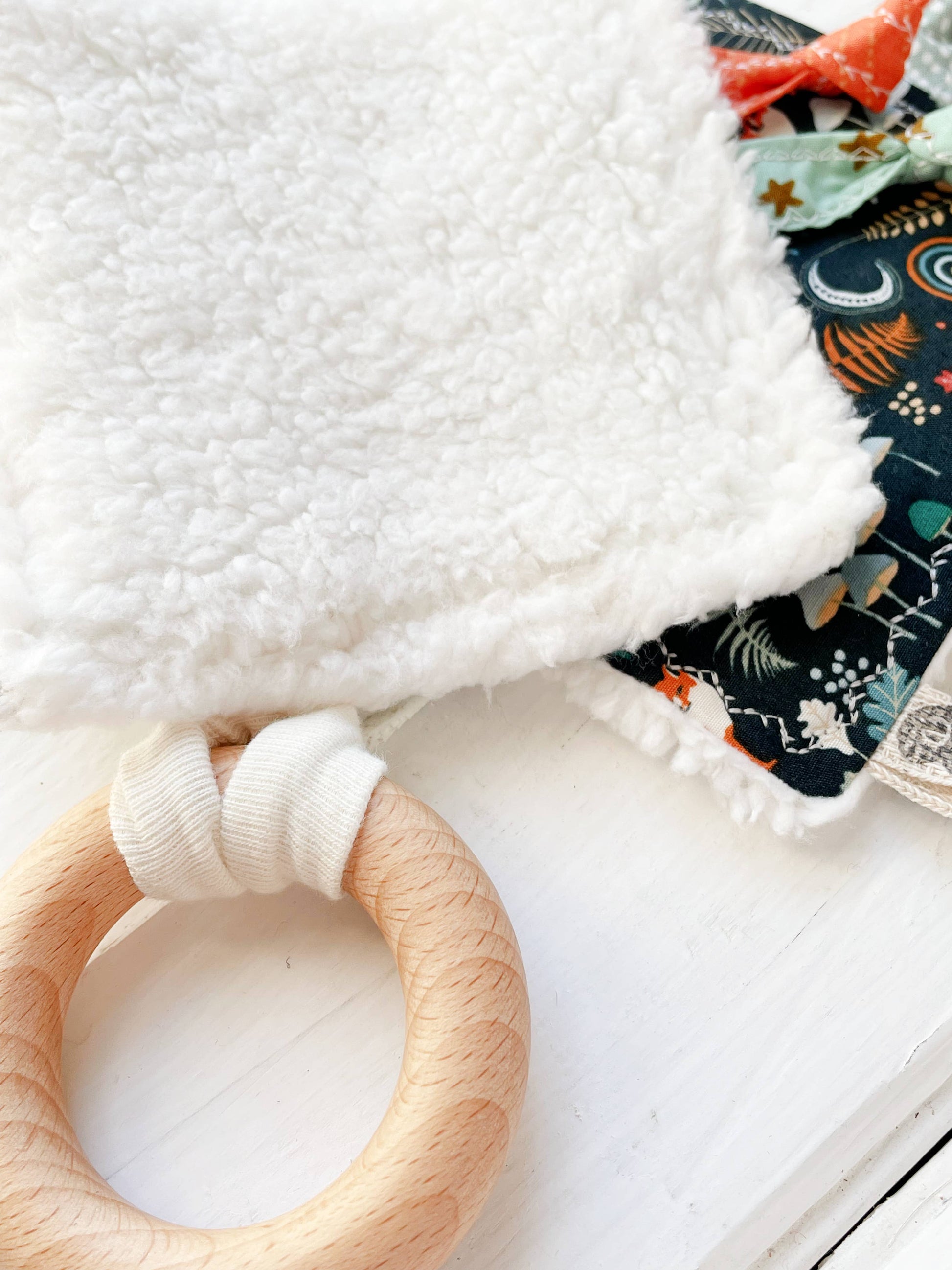 This Fox + Rainbows Crinkle Tag Toy is scattered with rainbows, moons, ferns, leaves and mushrooms. A modern, colorful and lighthearted sensory toy. Each crinkle toy has a plush, faux-sherpa backing with some seriously loud crinkle in the middle, two made-by-hand fabric ribbon tags that are knotted for exploration and possibly some chewing, as well as, a remove-able wooden teething ring.