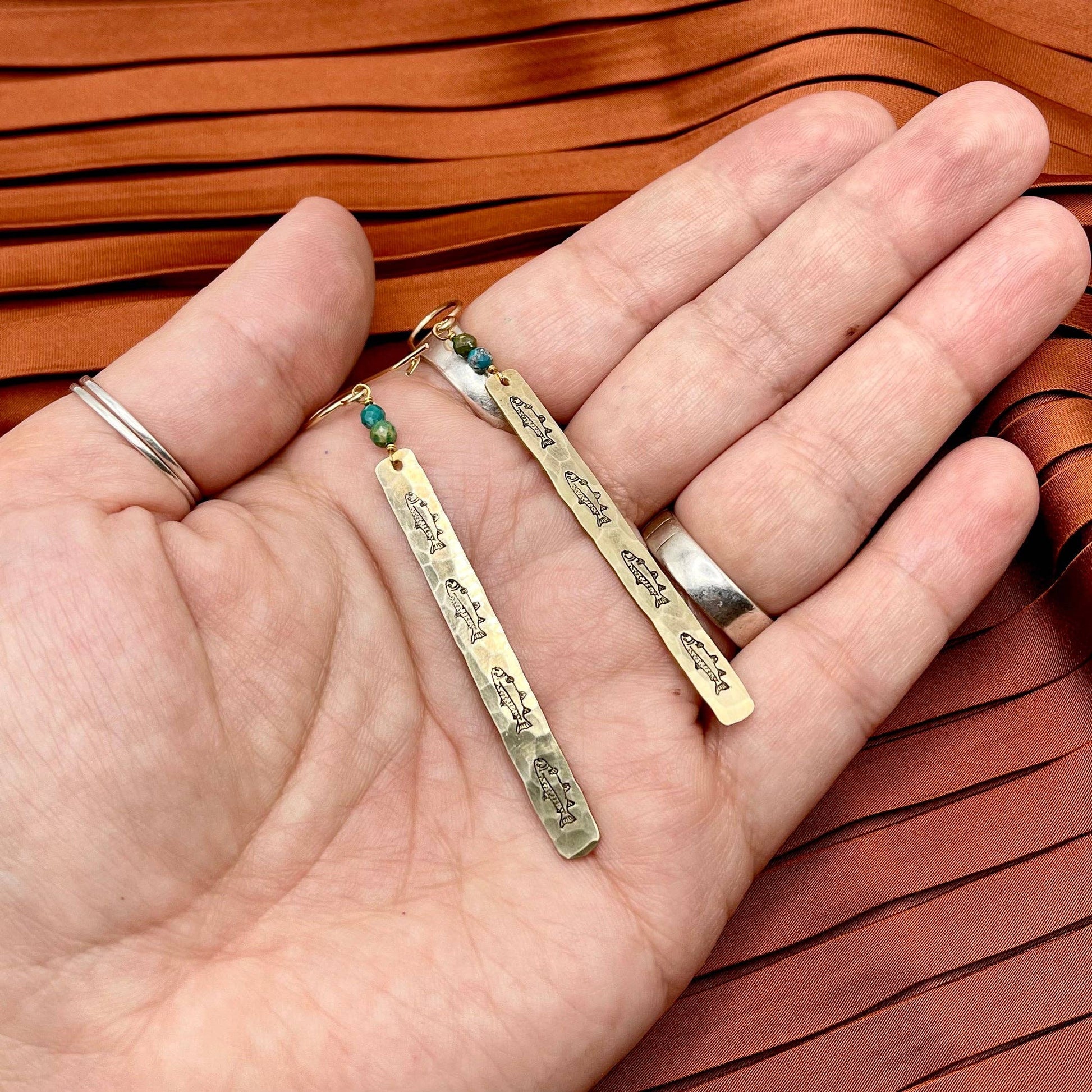 Gold or silver fish stamped pendants with turquoise jasper beads that hang from sterling silver or 14 karat gold filled ear wire.