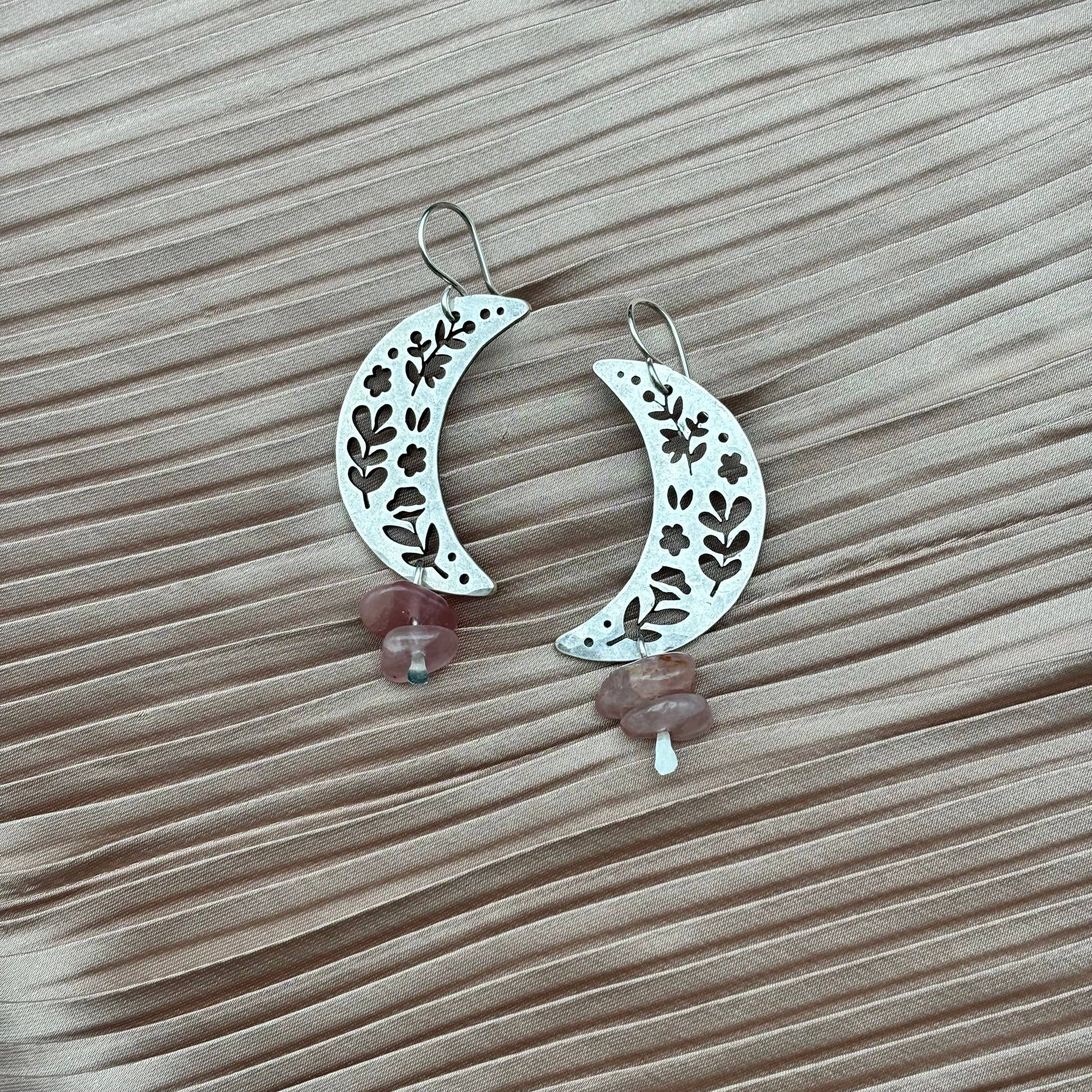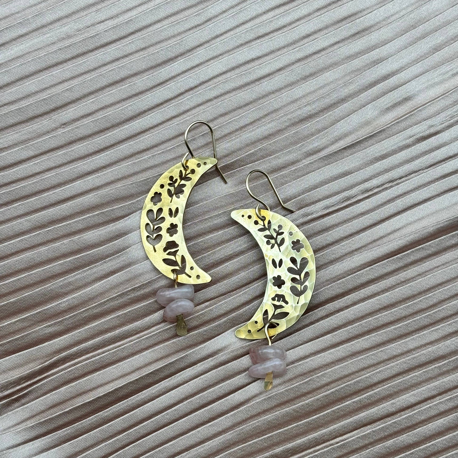 Gold or silver textured moon with two rose quartz beads that hang from handmade 14 karat gold filled or sterling silver ear wire.