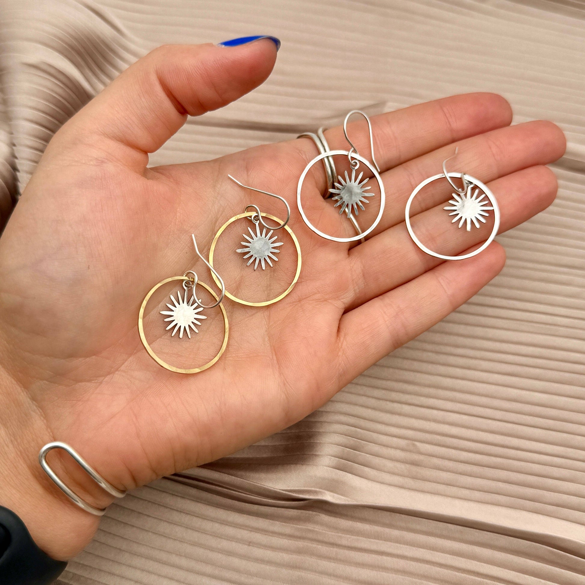 Gold or silver hoop and star pendants that hang from handmade sterling silver ear wire.