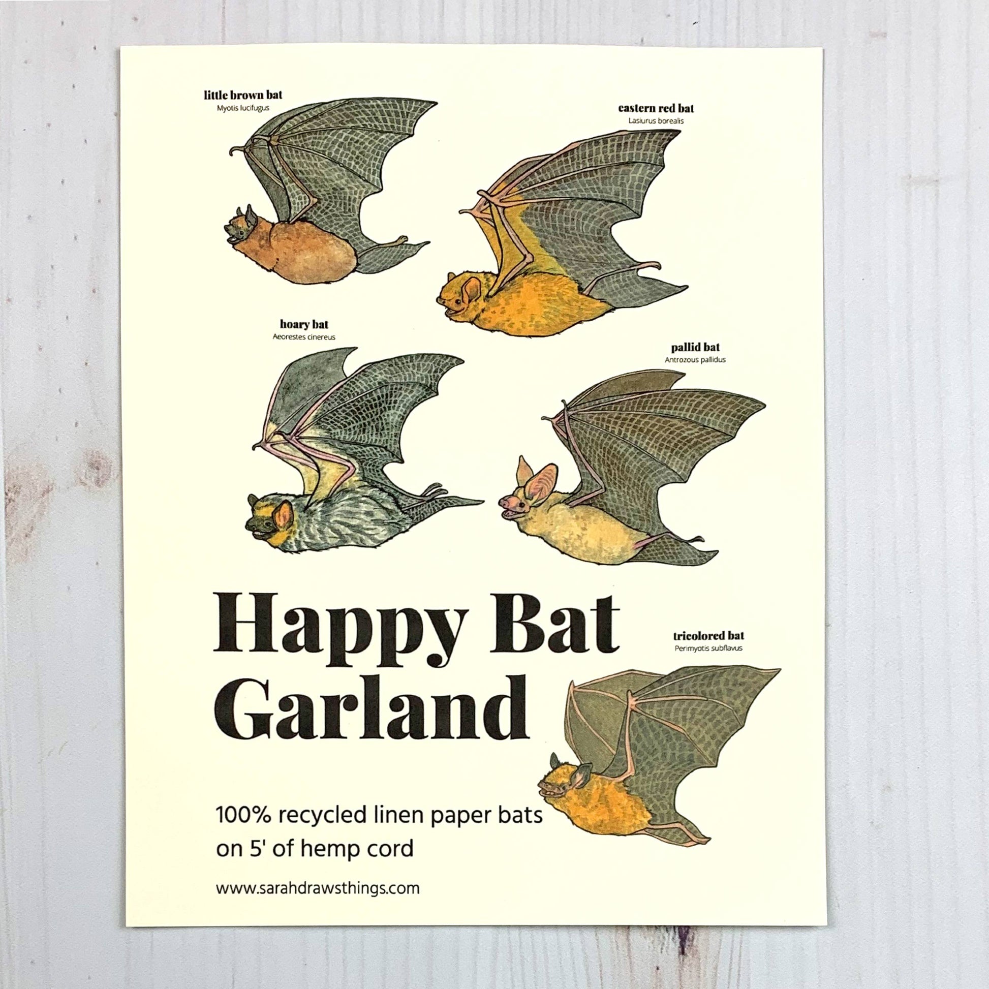 This 5' garland is made up of original watercolor, gouache and pencil illustrations. It features five North American bats. Each bat measures about 6" wide and is printed on 100% recycled linen paper, and strung on eco friendly hemp cord. It is packaged in a compostable plant-based sleeve with an 8x10" white backing board.