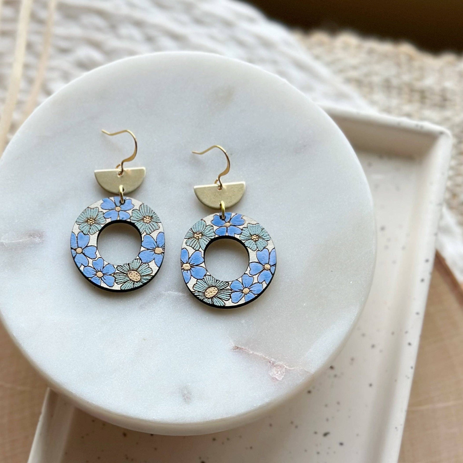 Made from hand painted basswood, raw brass, and hypoallergenic gold plated brass ear wires. Designed, cut, and assembled in our home studio in Selah, Washington.