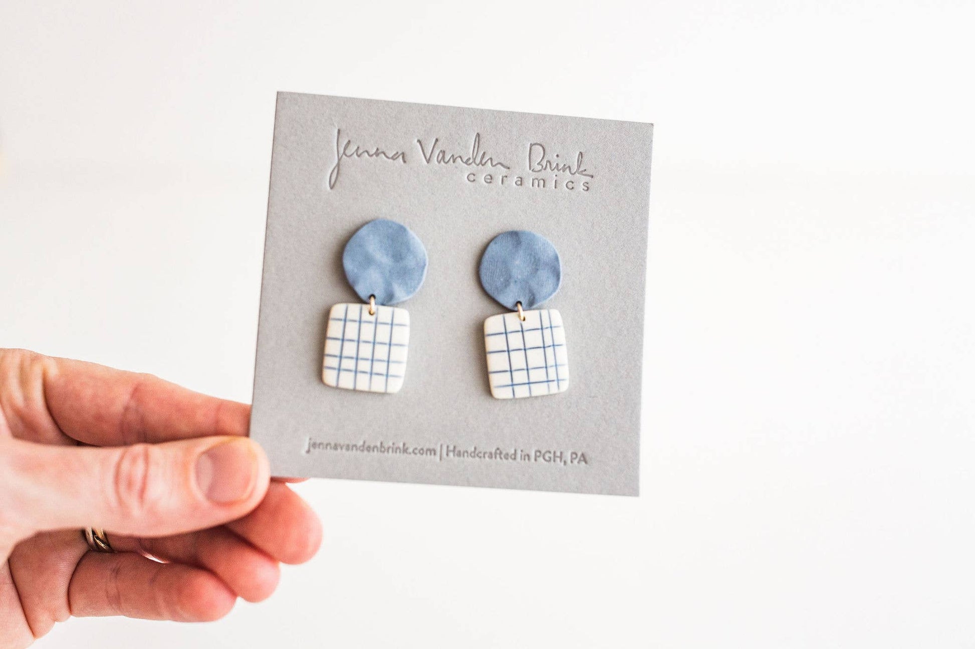 A nod to porch hangs and garden tending, the Lattice Earrings pair a pop of color with a fun pattern piece. The colored top is custom stained porcelain and the grid pattern is hand-carved and inlaid, coming together to form a very charming combo.