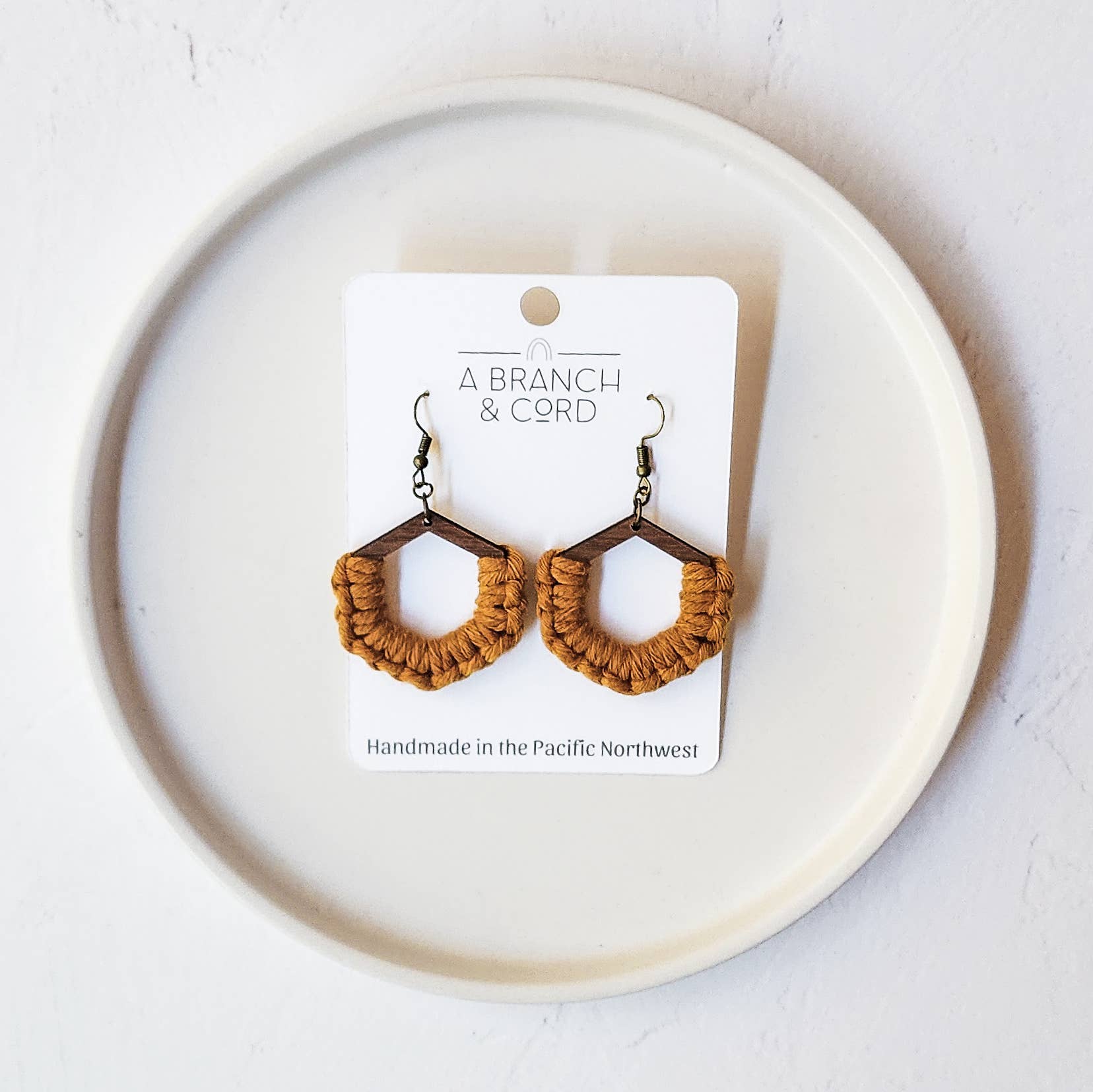 Handmade with 100% cotton cord, wooden earring blanks, and bronze, hypoallergenic earring hooks.