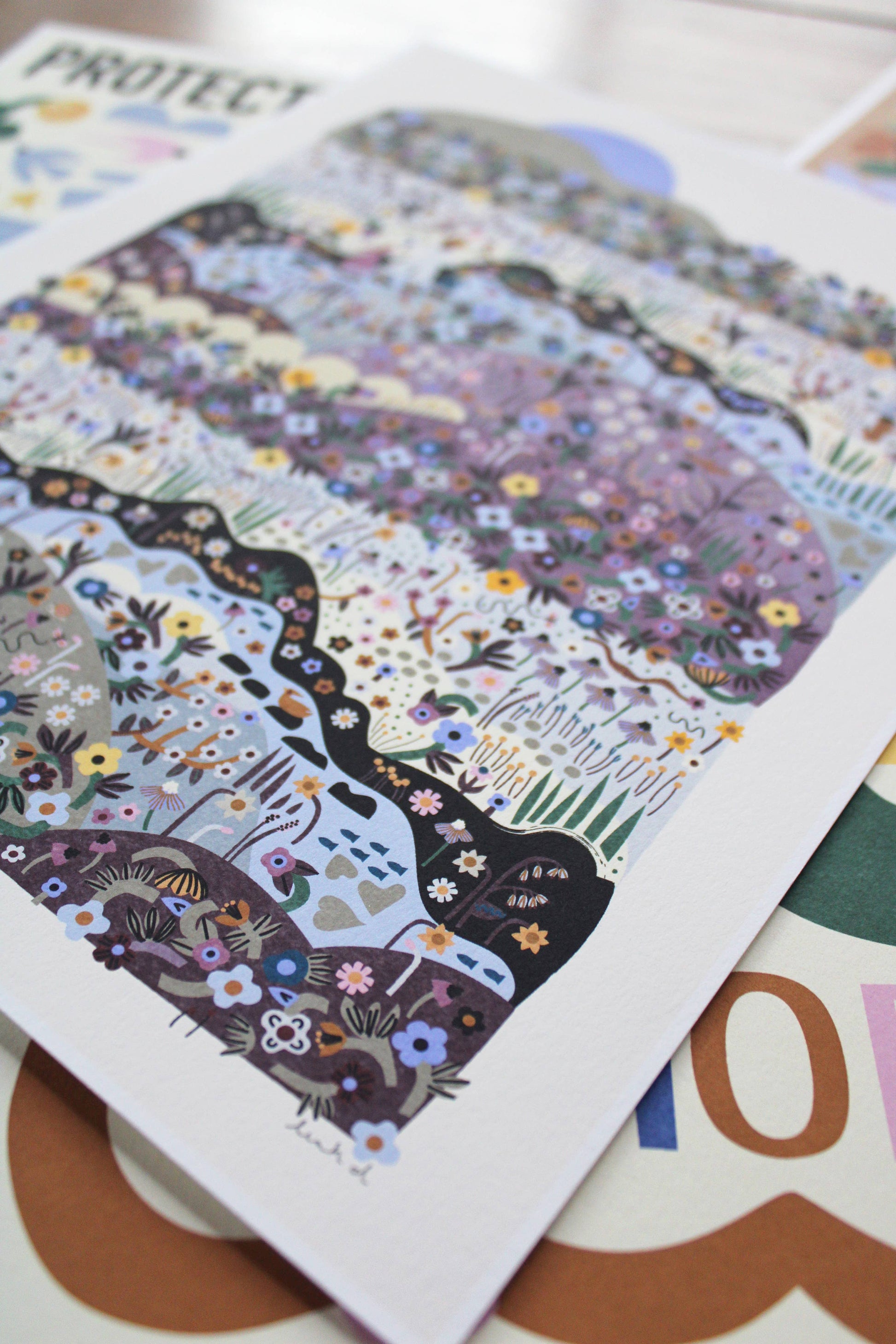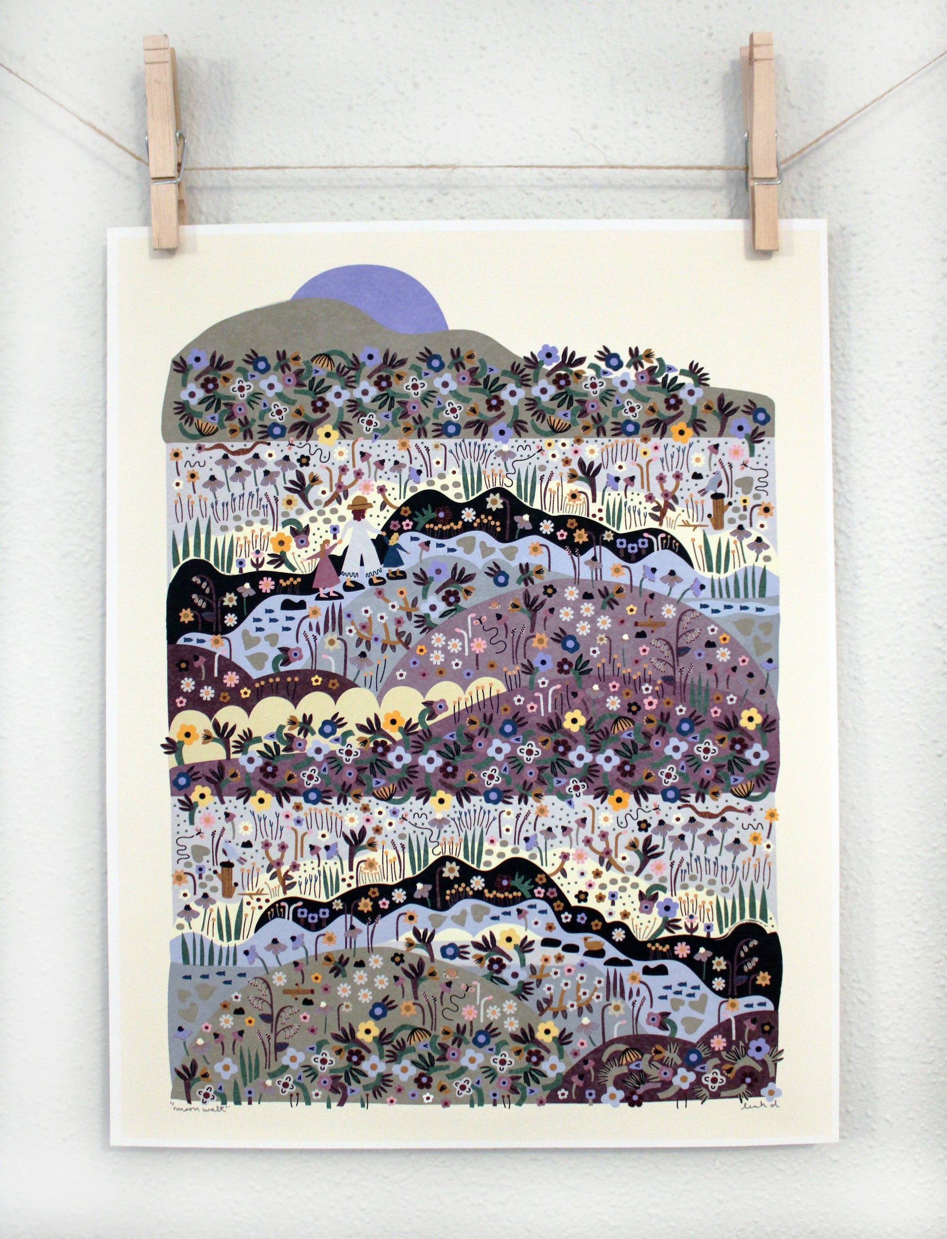This is an archival print of Leah's "Moon Walk" illustration in tones of blue, yellow, brown, orange, beige, pink, purple, gray, black, and green. The background is a light cream. Inspired by walks in nature with her daughters.