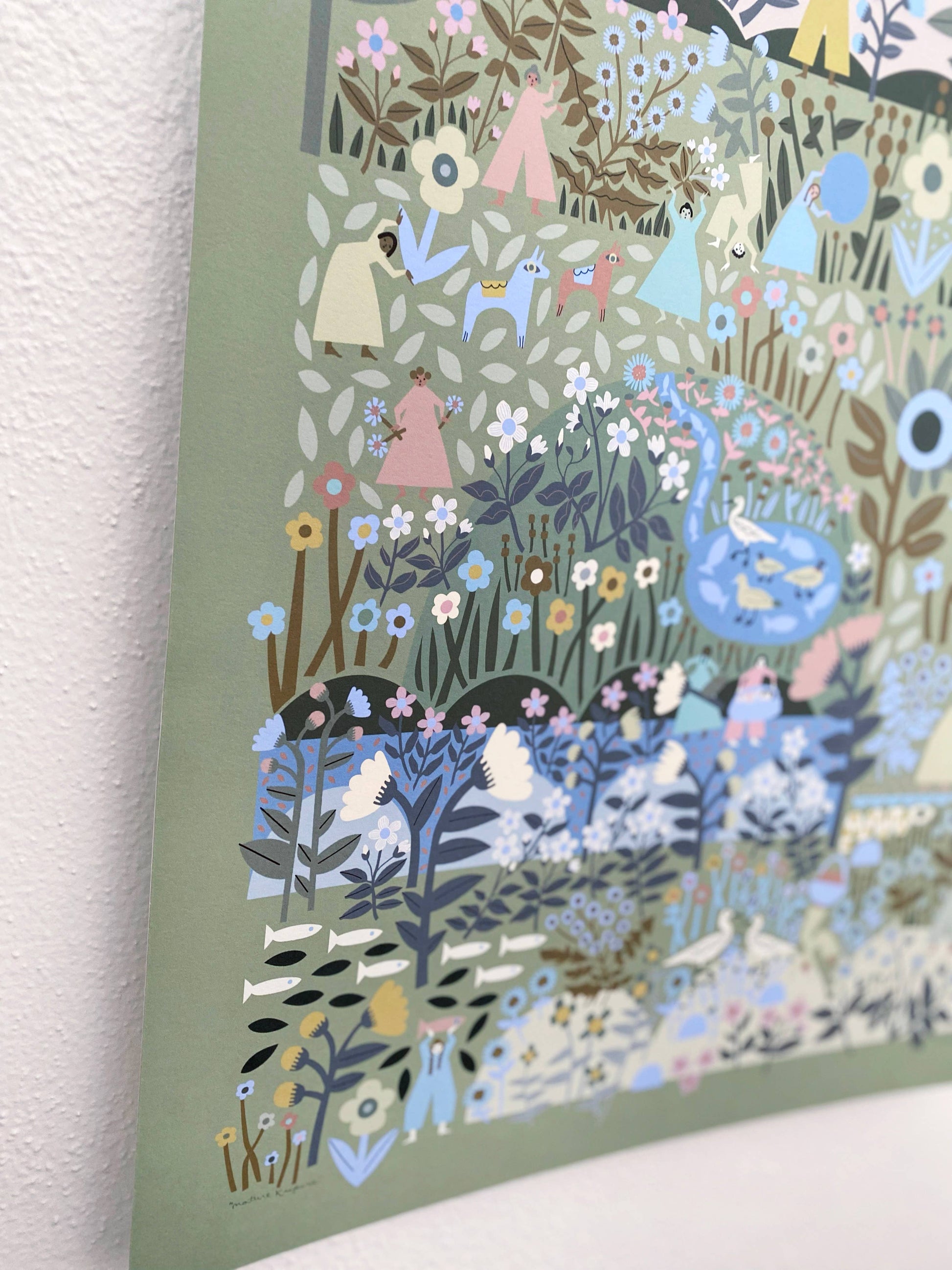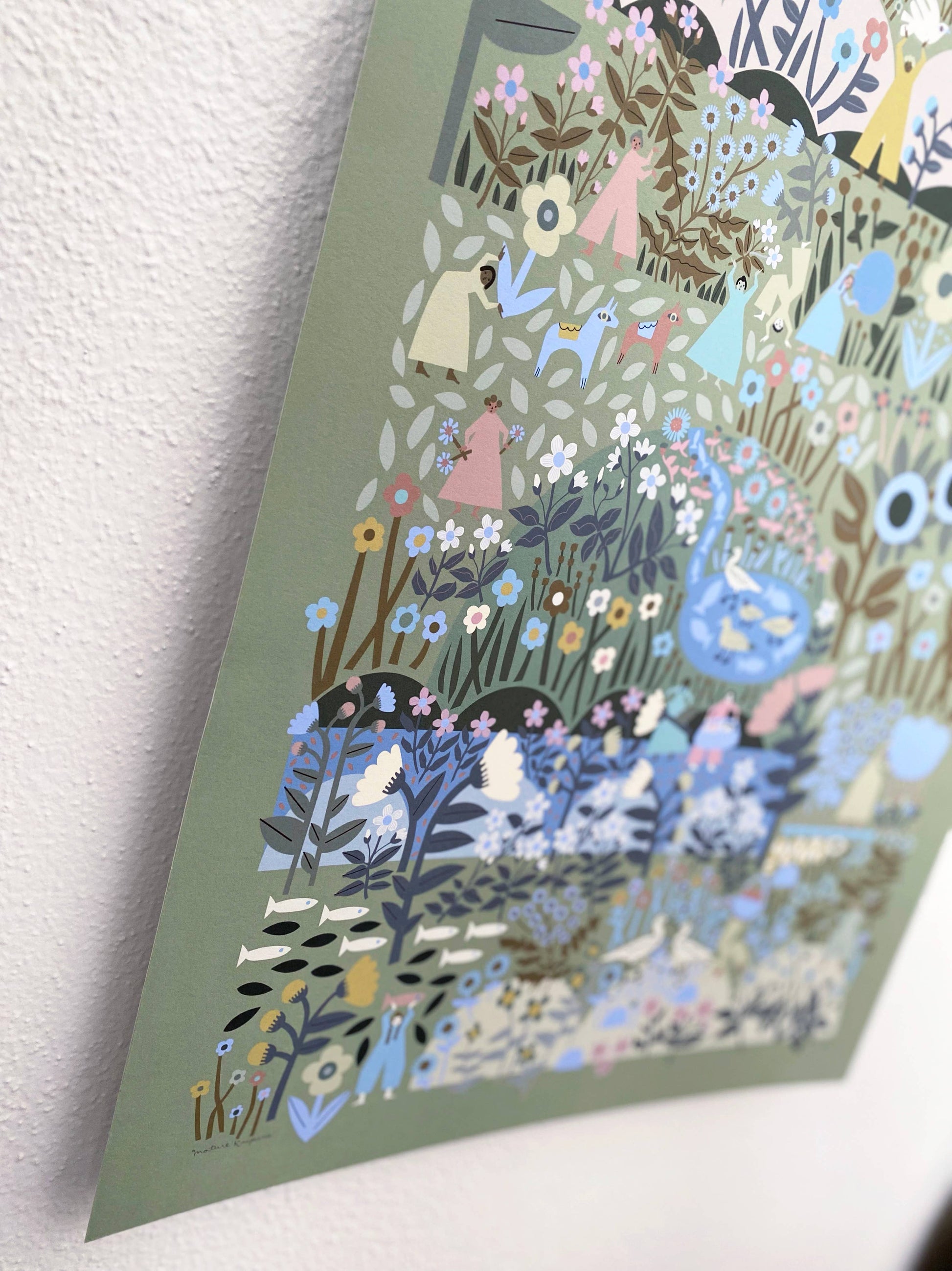 This is an archival print of Leah's "nature keepers" illustration in tones of blue, brown, lime, gray, peach, white, green, and beige on an avocado background.