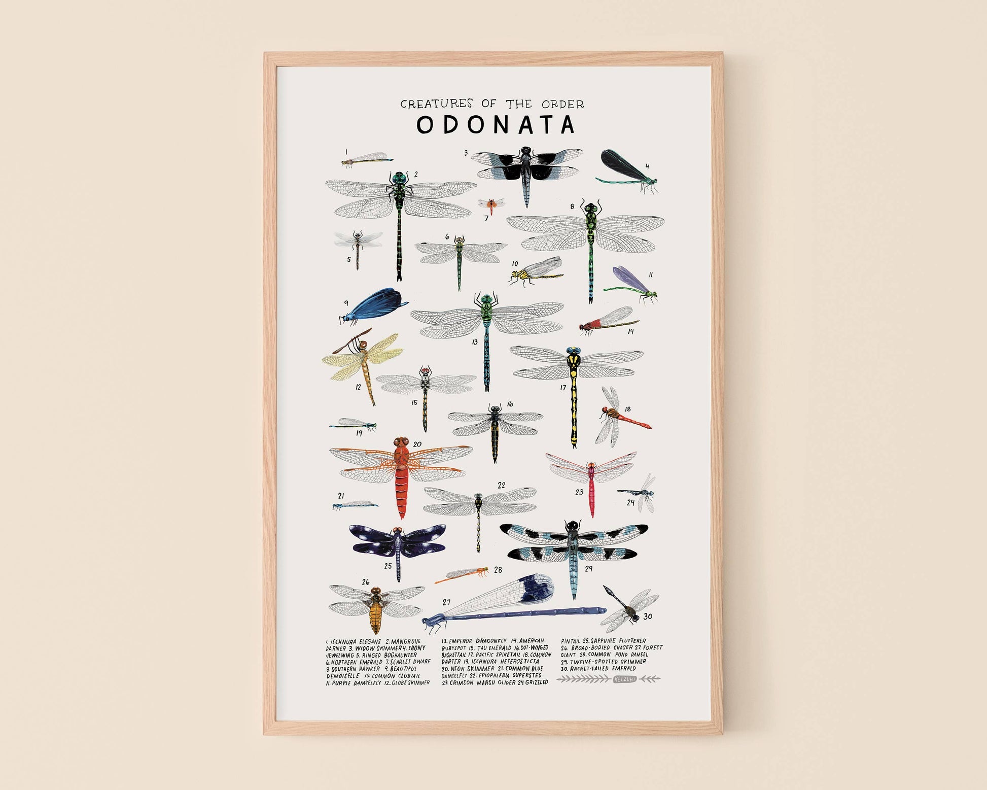Art print featuring 30 species from the taxonomic order Odonata. Kelsey’s original gouache paintings assembled in a vintage-inspired format, now available in two sizes.
