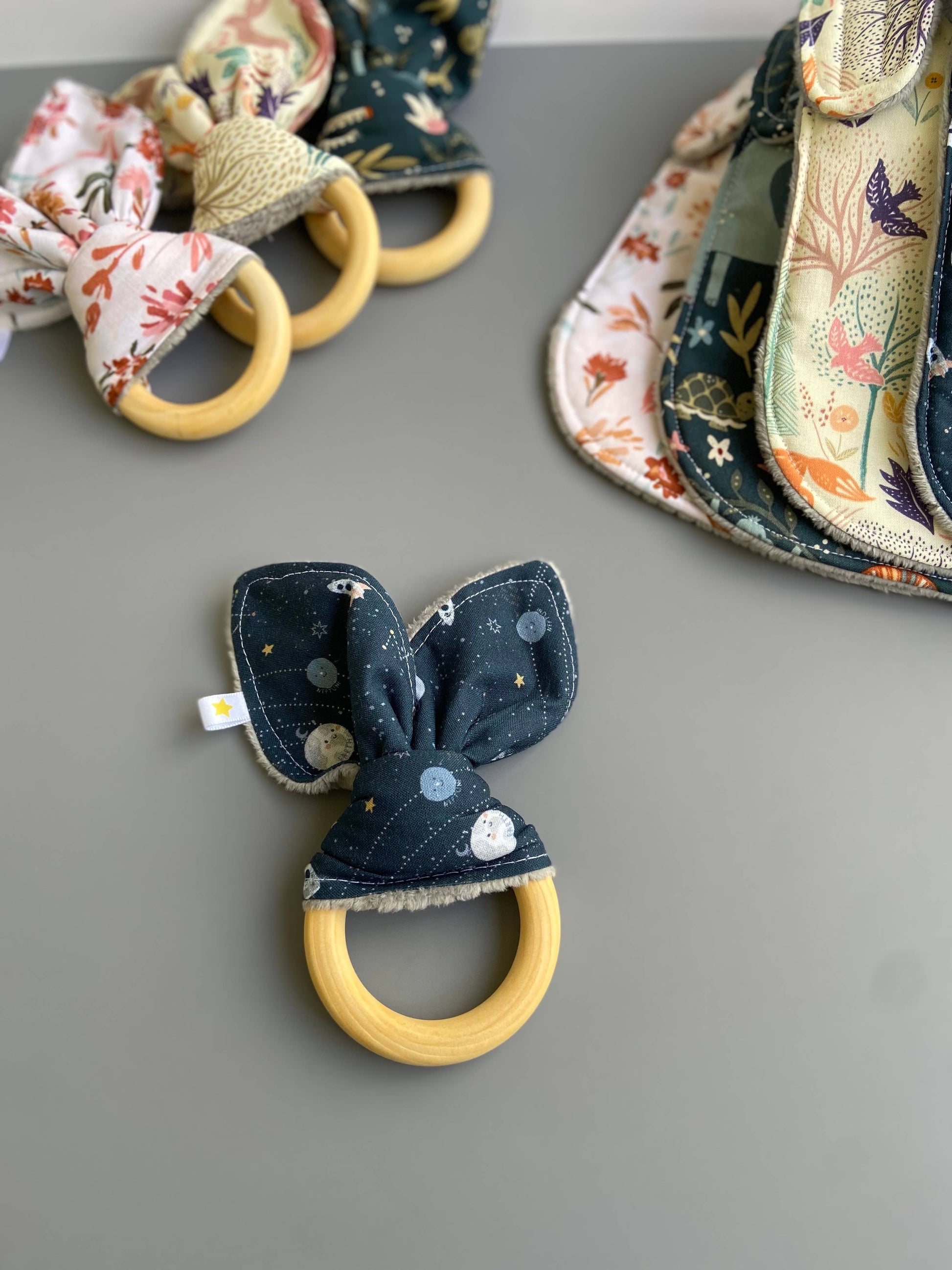 This toy does double duty! Each bunny ear looped fabric is backed with super soft snuggle fabric and has baby *crinkle paper sewn in for added sensory play.(Every wooden ring is rubbed in a small amount of organic coconut oil)