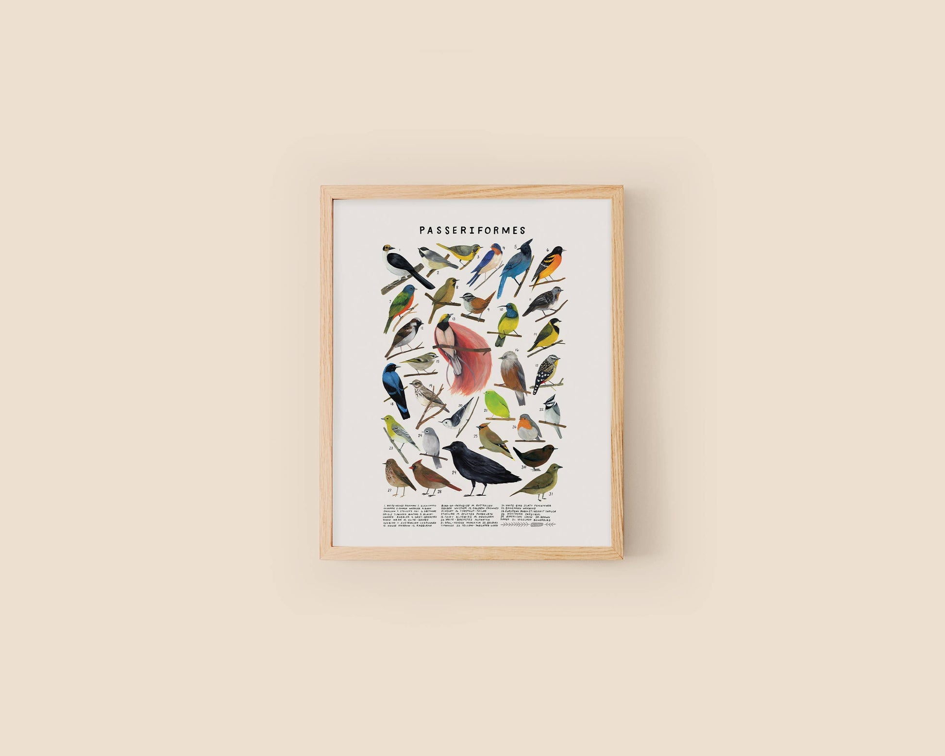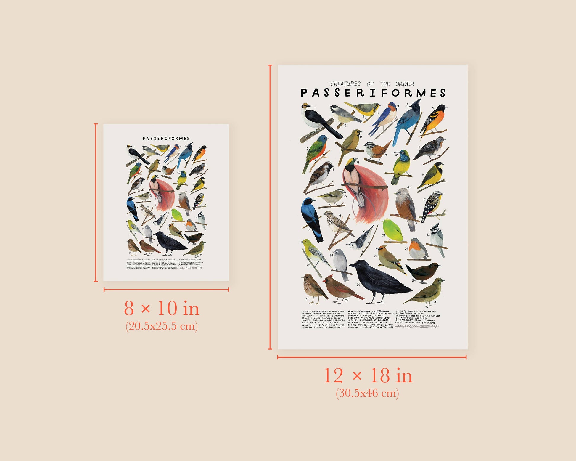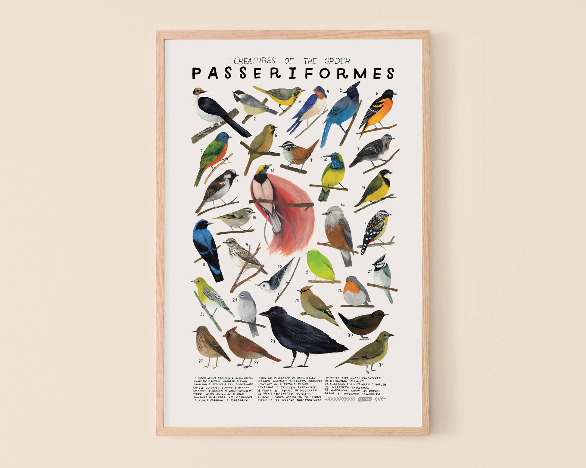 Art print featuring 31 species from the taxonomic order Passeriformes. Kelsey’s original gouache paintings assembled in a vintage-inspired format, now available in two sizes.