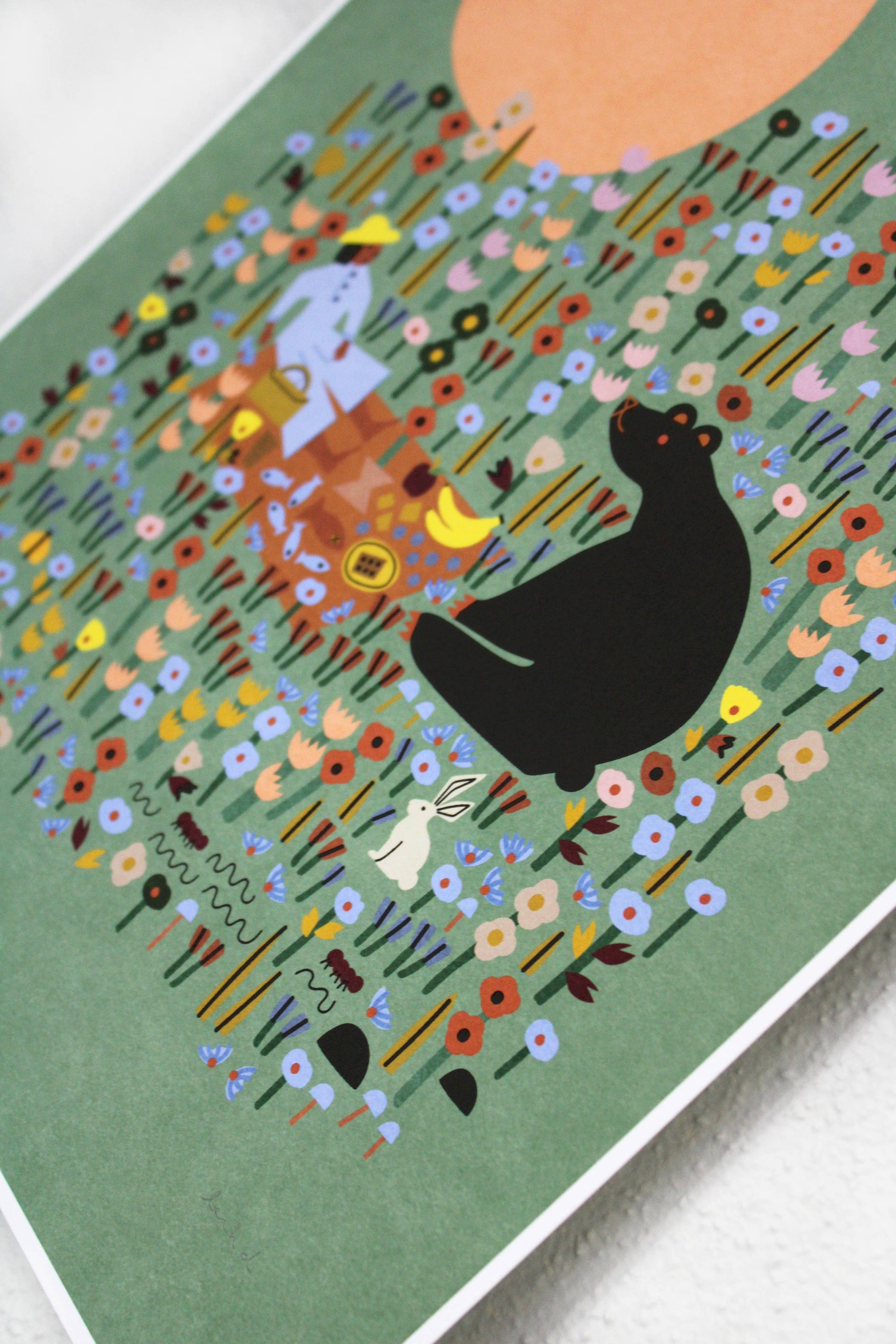 This is an archival print of Leah's "Picnic" illustration in tones of peach, black, yellow, brown, white, blue, green, lavender, coral, and brown on an avocado background.