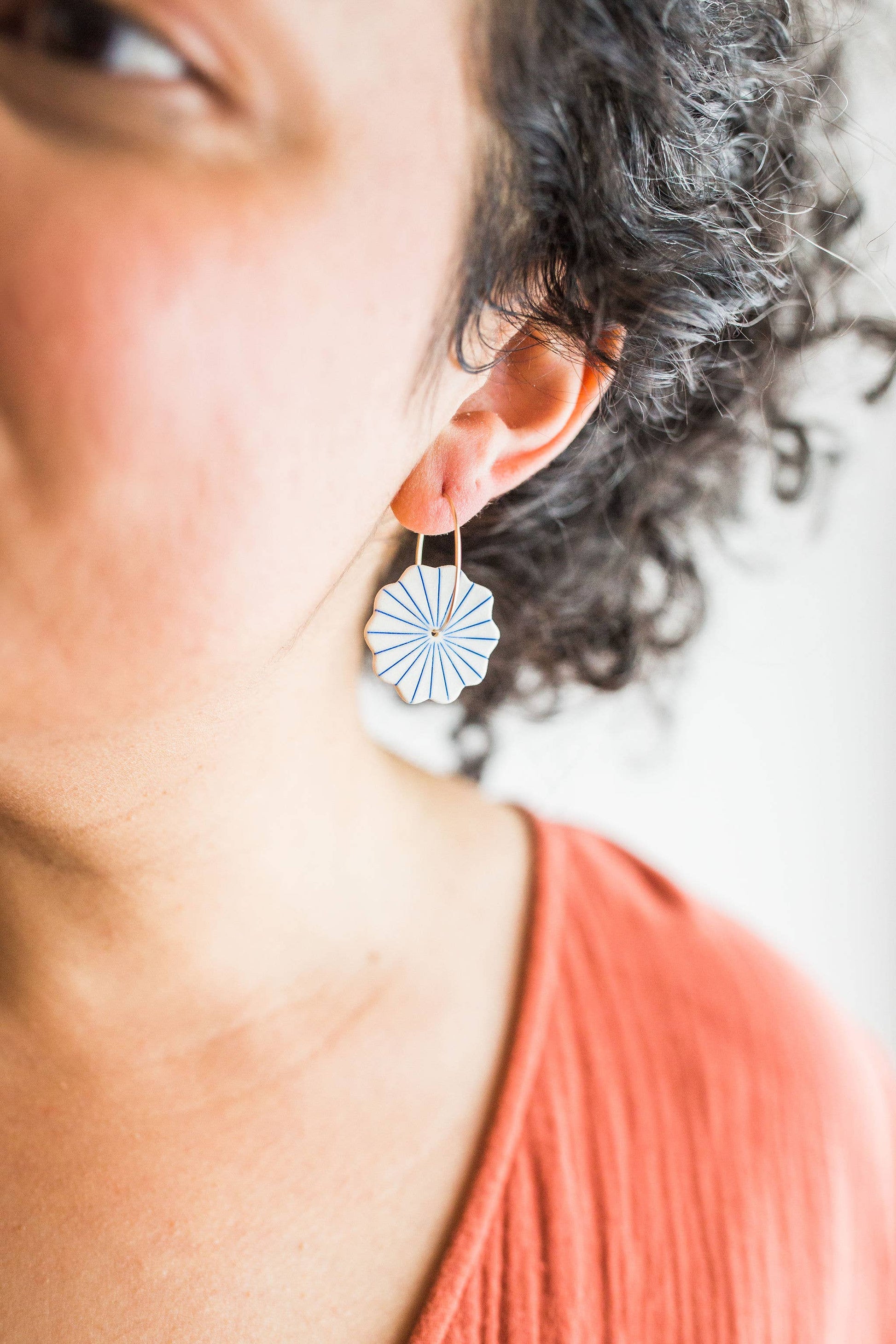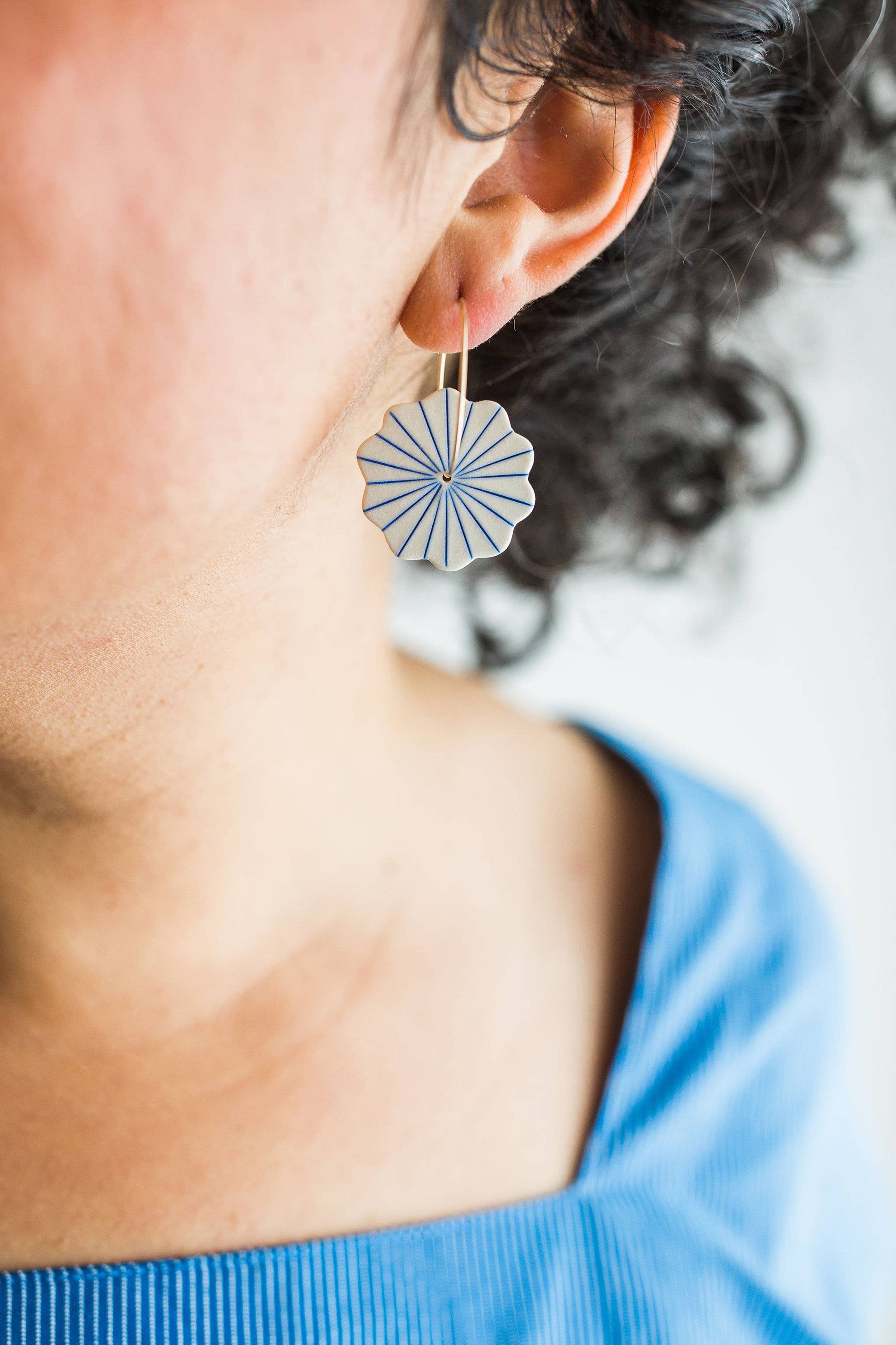 A bright blue striped sunburst piece suspended on a fine gold hoop. The movement, pattern and color combination make these a really special set.