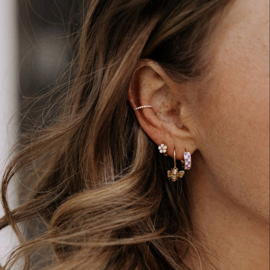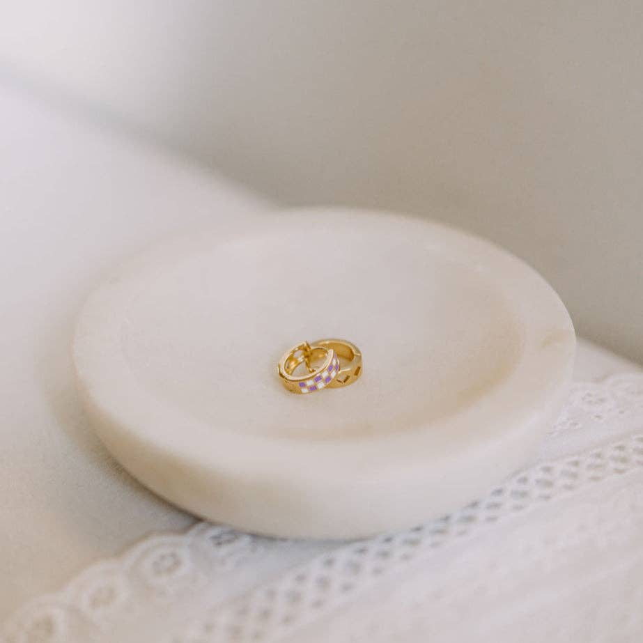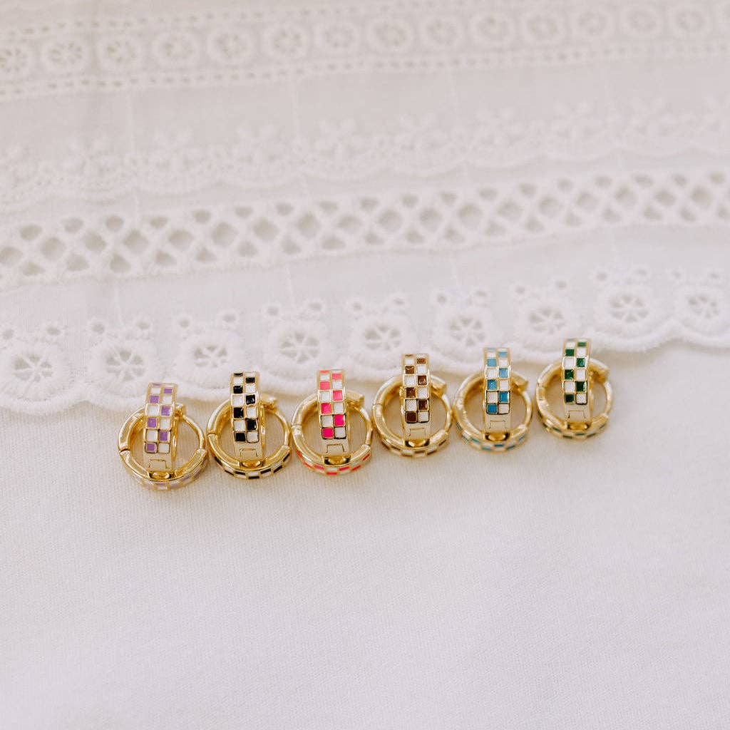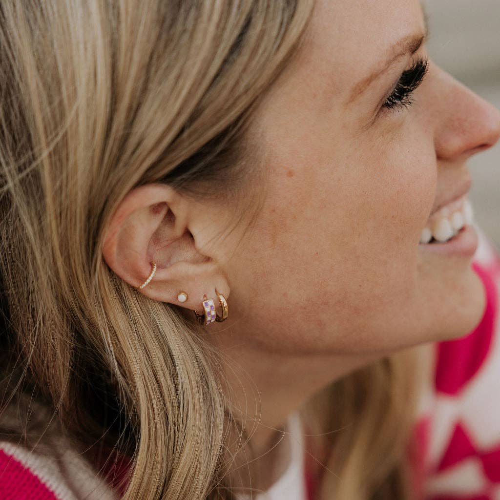 The Purple & White Checkered Hoops are made of high quality gold fill and are hypoallergenic and good for sensitive ears. They have a huggie closure style and are the cutest new jewelry trend! Outer diameter is 10mm.
