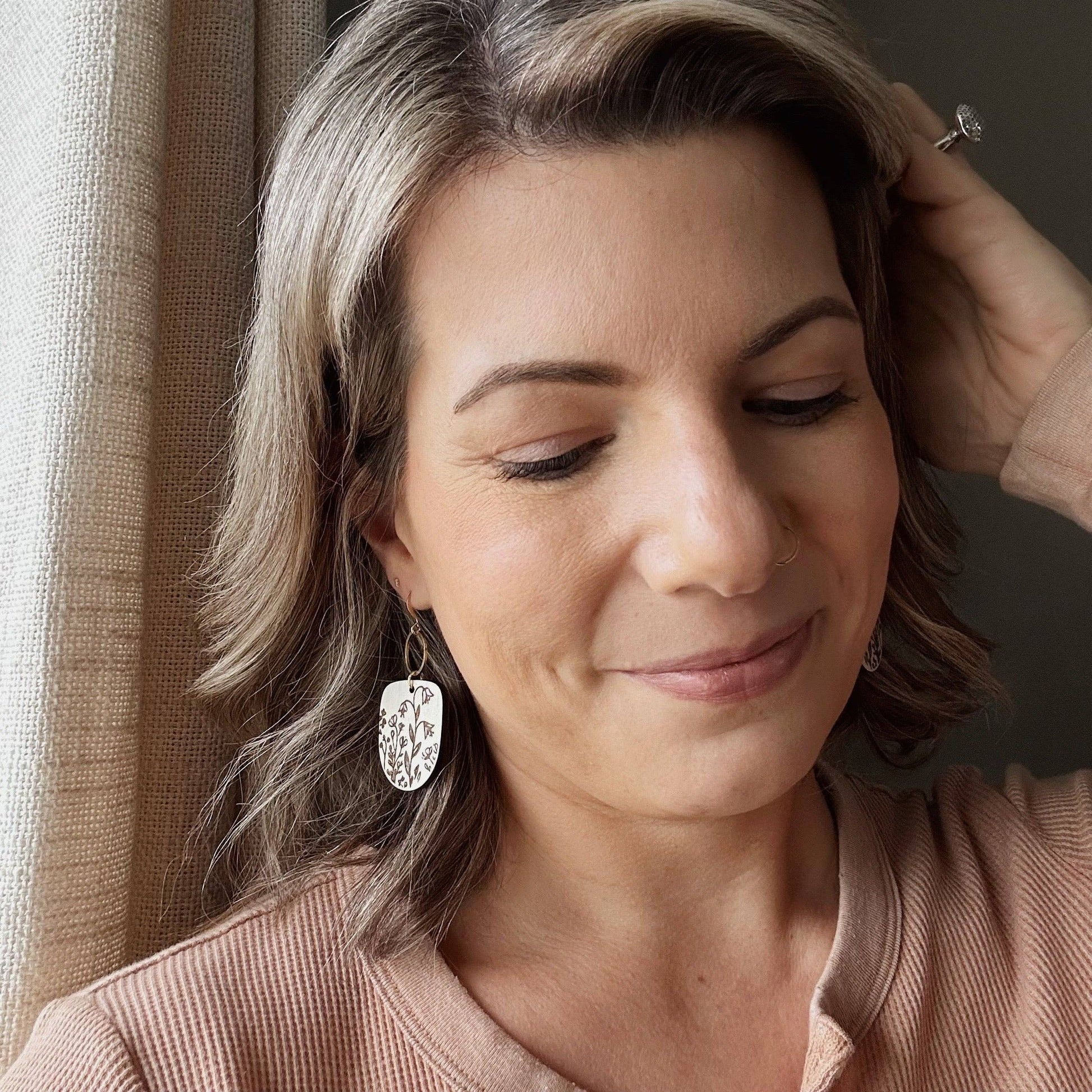 Made from hand-painted baltic birch, raw brass, and hypoallergenic gold-plated brass ear wires. Designed, cut, and assembled in our home studio in Selah, WA.