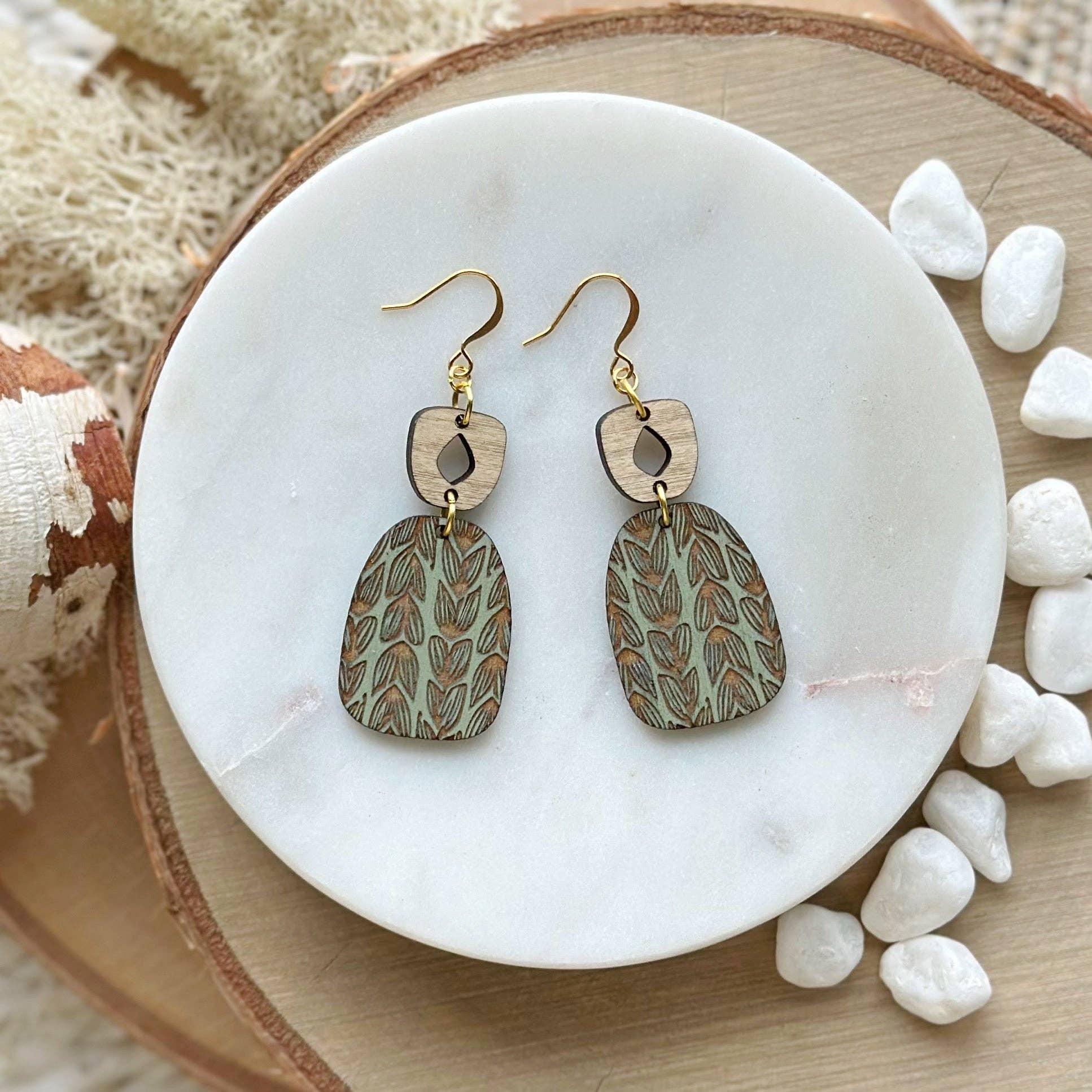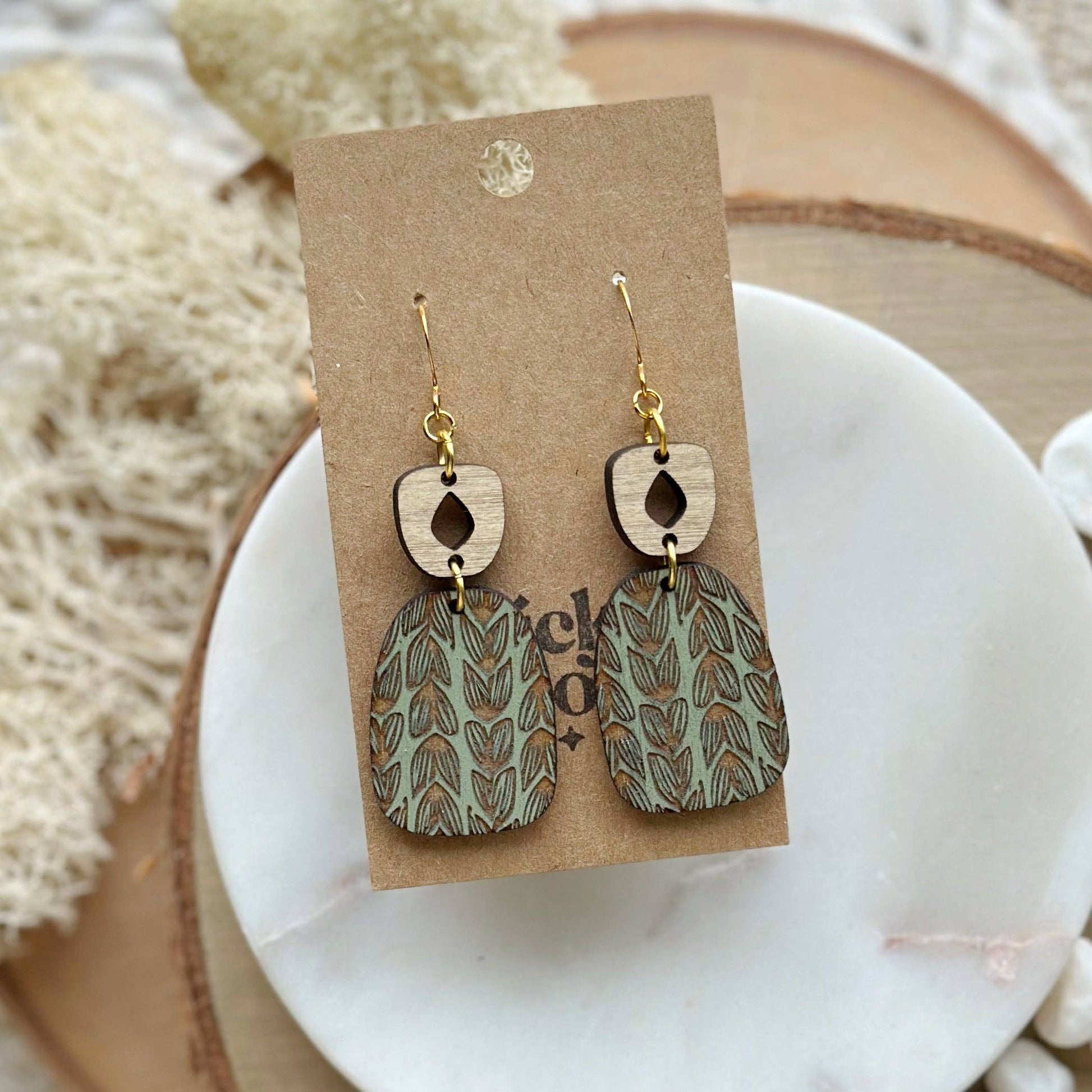 Made from hand-painted baltic birch and hypoallergenic gold-plated brass ear wires. Designed, cut, and assembled in our home studio in Selah, WA.