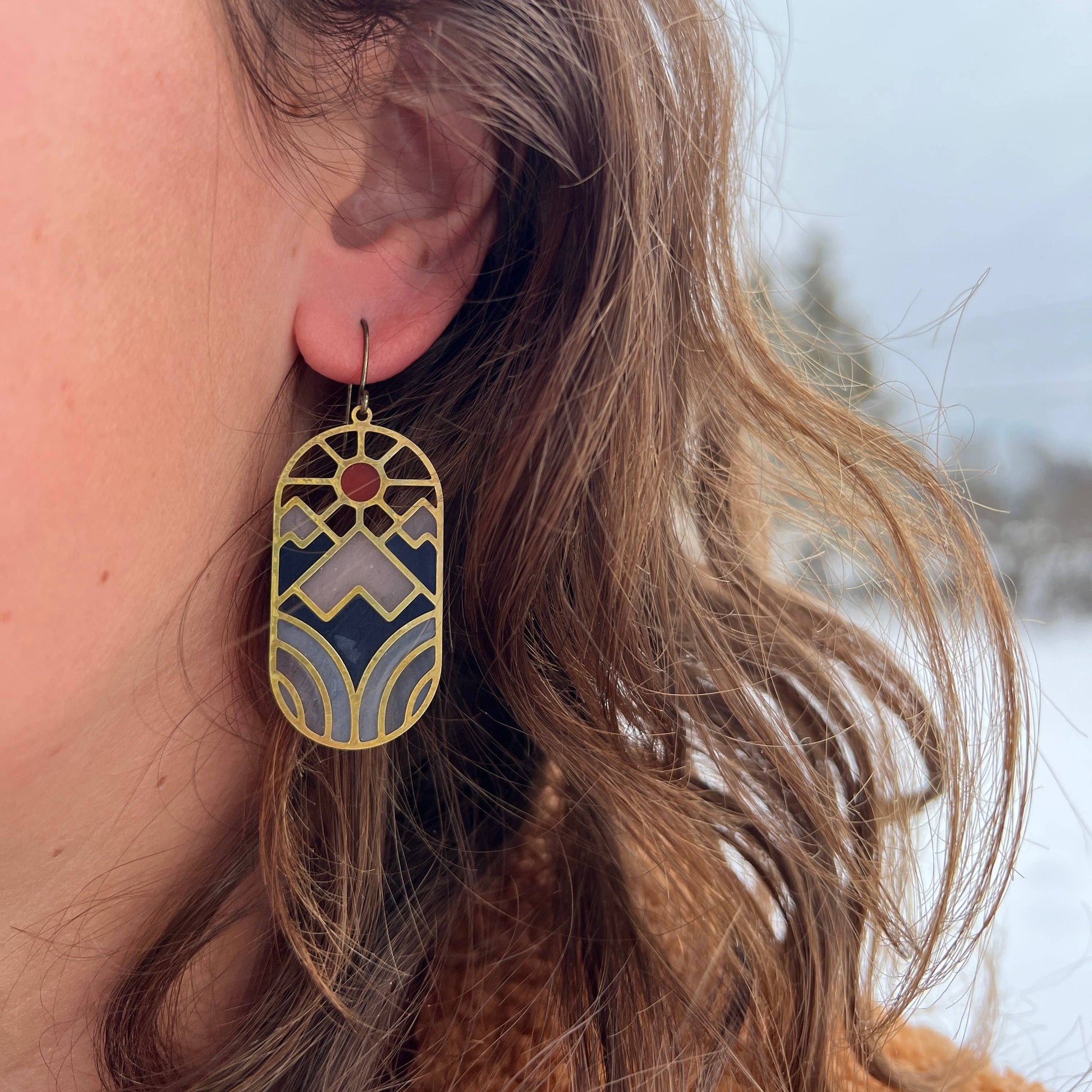 This modern earring features a brass nature-inspired design with soft-colored resin stained glass that catches the light beautifully. Handmade with high-quality components and solid brass findings, these delicate yet durable earrings are lightweight and comfortable to wear.