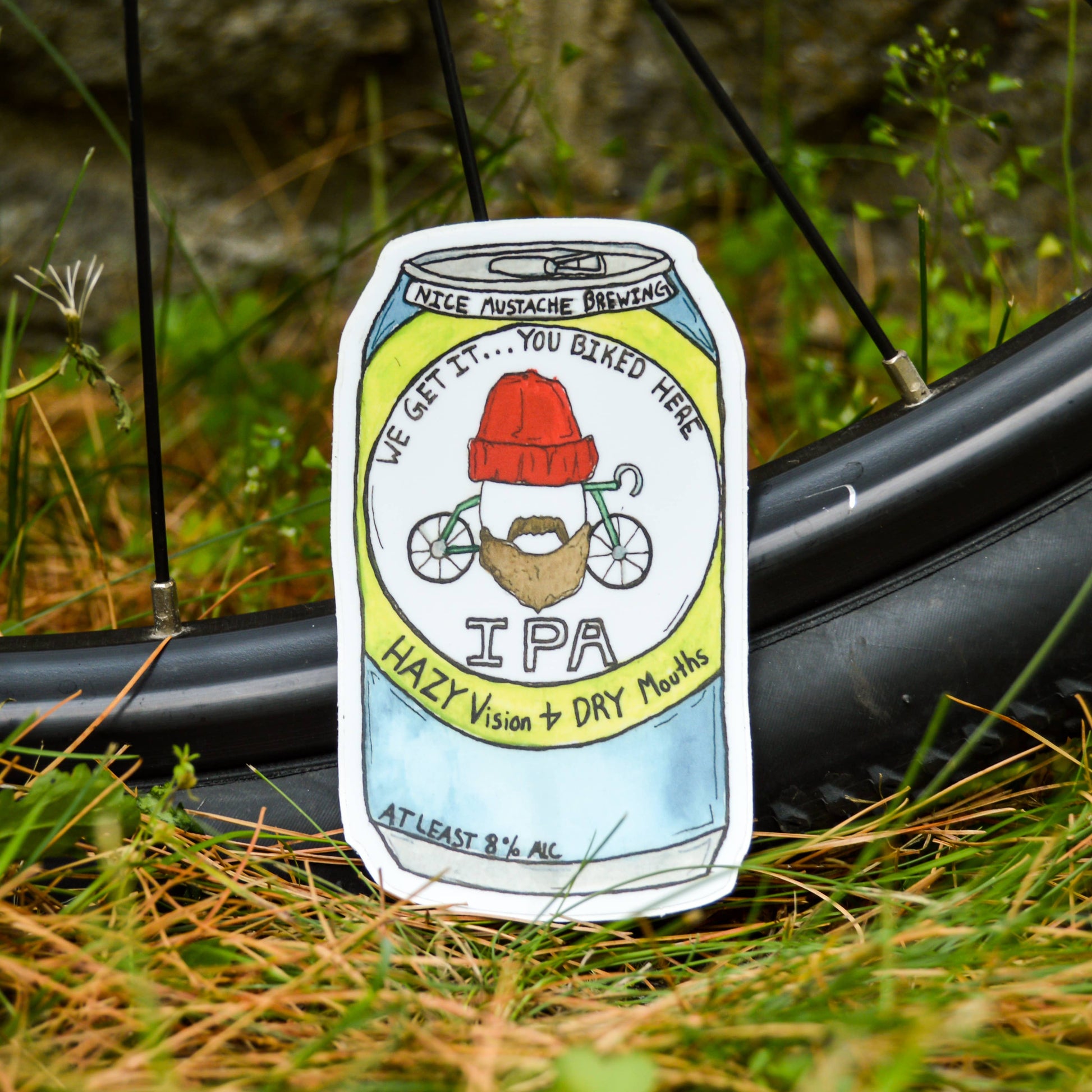 Showing up to the brewery in full spandex? Celebrate your biking prowess and love for strong IPAs with this design on your laptop, waterbottle, or other gear.