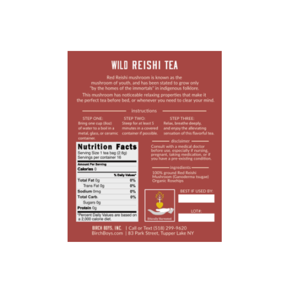Birch Boys Reishi Rose Tea is made from 100% Wild North American Reishi (Ganoderma tsugae) fruiting body. Birch Boys' Reishi is symbiotically harvested from over 100,000 acres of leased wild forest lands in NY's Adirondack Mountains.